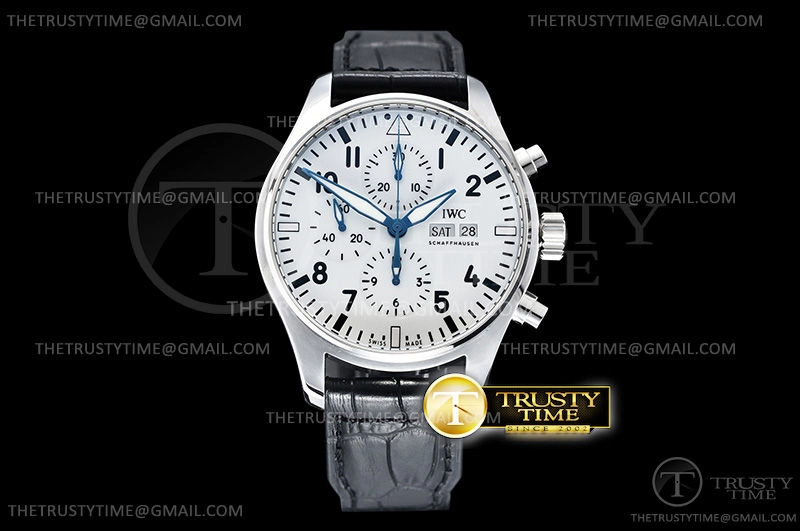 Часы IWC из коллекции Pilot's Chronograph. Спортивные мужские часы IWC Pilot's Watch Chronograph Edition 150 Years 43mm IW377725 премиального качества (Артикул магазина: IW-0541) оснащены надежным автоматическим механизмом с автоподзаводом (работает от амплитуды движения руки) калибра Valjoux-7750, в котором реализованы следующие функции: часовая, минутная и секундная стрелки, а так же хронограф, дата, день недели. Круглый корпус часов стального цвета, имеющий размер 43 мм и высоту 15 мм превосходно дополнит образ и украсит запястье своего обладателя. Для изготовления часов IWC Pilot's Watch Chronograph Edition 150 Years 43mm IW377725 предлагаемых в нашем интернет-магазине, применяются нержавеющая сталь 316F высокого качества (Швейцарский стандарт), а так же сапфировое стекло высокой прочности, благодаря чему обеспечивается максимальная защита от сколов и механических повреждений. Отличительной чертой данной модели является белый циферблат, часовые индексы которого обеспечивают арабские цифры. Завершает образ кожаный ремешок черного цвета с фирменной классической застежкой IWC. Водонепроницаемость данной модели составляет 30М (WR30) – допускается минимальное воздействие с водой.