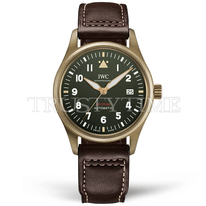 Часы IWC из коллекции Pilot's. Классические мужские часы IWC Pilot's Watch Automatic Spitfire 39mm IW326802 премиального качества (Артикул магазина: IW-0530) оснащены надежным автоматическим механизмом с автоподзаводом (работает от амплитуды движения руки) калибра MY9015, в котором реализованы следующие функции: часовая, минутная и секундная стрелки, а так же дата. Круглый корпус часов бронзового цвета, имеющий размер 39 мм и высоту 10.5 мм превосходно дополнит образ и украсит запястье своего обладателя. Для изготовления часов IWC Pilot's Watch Automatic Spitfire 39mm IW326802 предлагаемых в нашем интернет-магазине, применяются бронза высокого качества (Швейцарский стандарт), а так же сапфировое стекло высокой прочности, благодаря чему обеспечивается максимальная защита от сколов и механических повреждений. Отличительной чертой данной модели является зеленый циферблат, часовые индексы которого обеспечивают арабские цифры. Завершает образ кожаный ремешок коричневого цвета с фирменной классической застежкой IWC. Водонепроницаемость данной модели составляет 30М (WR30) – допускается минимальное воздействие с водой.