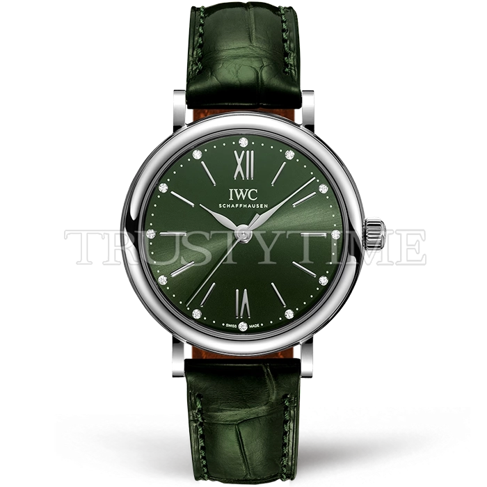 Часы IWC из коллекции Portofino. Классические женские часы IWC Portofino Midsize Automatic 34 IW357405 премиального качества (Артикул магазина: IW-0916) оснащены надежным автоматическим механизмом с автоподзаводом (работает от амплитуды движения руки) калибра IWC35100, в котором реализованы следующие функции: часовая, минутная и секундная стрелки, а так же максимально простой функционал без усложнений. Круглый корпус часов стального цвета, имеющий размер 34 мм и высоту 8.6 мм превосходно дополнит образ и украсит запястье своего обладателя. Для изготовления часов IWC Portofino Midsize Automatic 34 IW357405 предлагаемых в нашем интернет-магазине, применяются нержавеющая сталь 316L высокого качества (Швейцарский стандарт), а так же сапфировое стекло высокой прочности, благодаря чему обеспечивается максимальная защита от сколов и механических повреждений. Отличительной чертой данной модели является зеленый циферблат, часовые индексы которого обеспечивают часовые метки. Завершает образ кожаный ремешок зеленого цвета с фирменной раскладывающейся застежкой IWC. Водонепроницаемость данной модели составляет 30М (WR30) – допускается минимальное воздействие с водой.