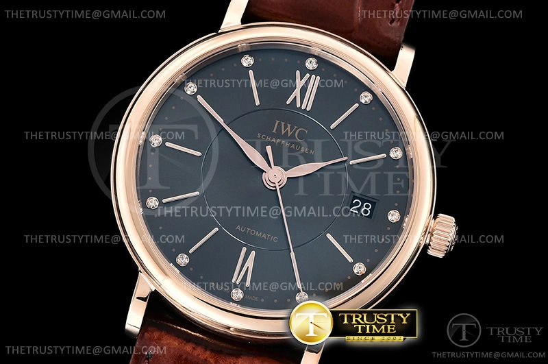 Часы IWC из коллекции Portofino. Классические женские часы IWC Portofino Automatic IW458106 премиального качества (Артикул магазина: IW-0568) оснащены надежным автоматическим механизмом с автоподзаводом (работает от амплитуды движения руки) калибра MY9015, в котором реализованы следующие функции: часовая, минутная и секундная стрелки, а так же дата. Круглый корпус часов розового цвета, имеющий размер 37 мм и высоту 9 мм превосходно дополнит образ и украсит запястье своего обладателя. Для изготовления часов IWC Portofino Automatic IW458106 предлагаемых в нашем интернет-магазине, применяются нержавеющая сталь 316L высокого качества (Швейцарский стандарт), а так же сапфировое стекло высокой прочности, благодаря чему обеспечивается максимальная защита от сколов и механических повреждений. Отличительной чертой данной модели является серый циферблат, часовые индексы которого обеспечивают часовые метки. Завершает образ кожаный ремешок коричневого цвета с фирменной классической застежкой IWC. Водонепроницаемость данной модели составляет 30М (WR30) – допускается минимальное воздействие с водой.