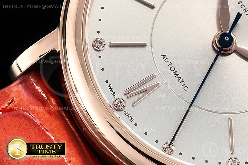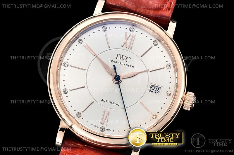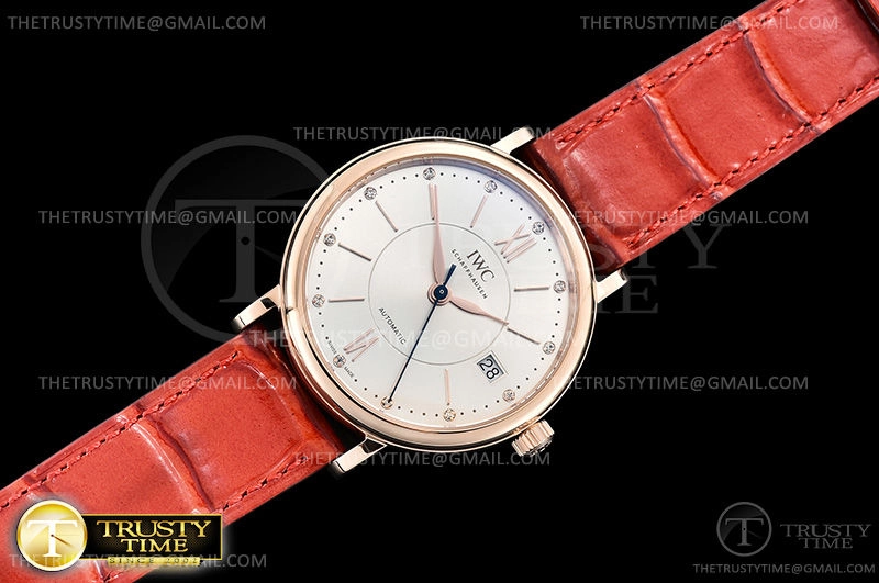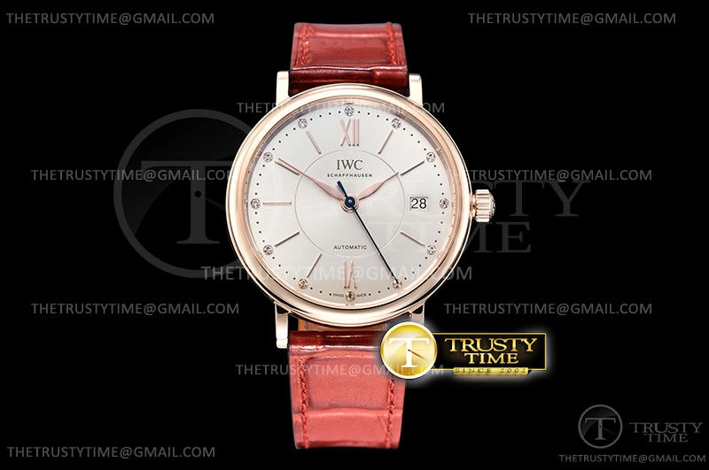 Часы IWC из коллекции Portofino. Классические женские часы IWC Portofino Automatic 37mm IW458105 премиального качества (Артикул магазина: IW-0570) оснащены надежным автоматическим механизмом с автоподзаводом (работает от амплитуды движения руки) калибра MY9015, в котором реализованы следующие функции: часовая, минутная и секундная стрелки, а так же дата. Круглый корпус часов розового цвета, имеющий размер 37 мм и высоту 9 мм превосходно дополнит образ и украсит запястье своего обладателя. Для изготовления часов IWC Portofino Automatic 37mm IW458105 предлагаемых в нашем интернет-магазине, применяются нержавеющая сталь 316L высокого качества (Швейцарский стандарт), а так же сапфировое стекло высокой прочности, благодаря чему обеспечивается максимальная защита от сколов и механических повреждений. Отличительной чертой данной модели является серебристый циферблат, часовые индексы которого обеспечивают часовые метки. Завершает образ кожаный ремешок красного цвета с фирменной классической застежкой IWC. Водонепроницаемость данной модели составляет 30М (WR30) – допускается минимальное воздействие с водой.