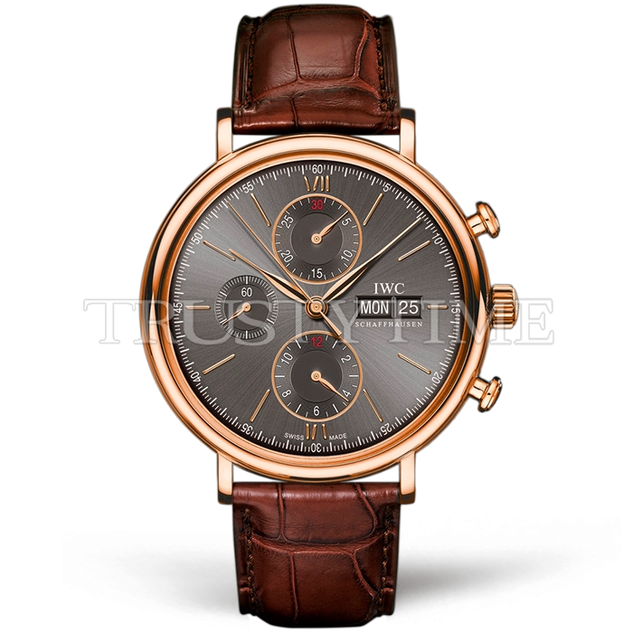 Часы IWC из коллекции Portofino Chronograph. Спортивные мужские часы IWC Portofino Chronograph 42mm IW391021 премиального качества (Артикул магазина: IW-0593) оснащены надежным автоматическим механизмом с автоподзаводом (работает от амплитуды движения руки) калибра Valjoux-7750, в котором реализованы следующие функции: часовая, минутная и секундная стрелки, а так же дата, день недели, хронограф. Круглый корпус часов розового цвета, имеющий размер 42 мм и высоту 14.5 мм превосходно дополнит образ и украсит запястье своего обладателя. Для изготовления часов IWC Portofino Chronograph 42mm IW391021 предлагаемых в нашем интернет-магазине, применяются нержавеющая сталь 316F высокого качества (Швейцарский стандарт), а так же сапфировое стекло высокой прочности, благодаря чему обеспечивается максимальная защита от сколов и механических повреждений. Отличительной чертой данной модели является серый циферблат, часовые индексы которого обеспечивают часовые метки. Завершает образ кожаный ремешок коричневого цвета с фирменной классической застежкой IWC. Водонепроницаемость данной модели составляет 30М (WR30) – допускается минимальное воздействие с водой.