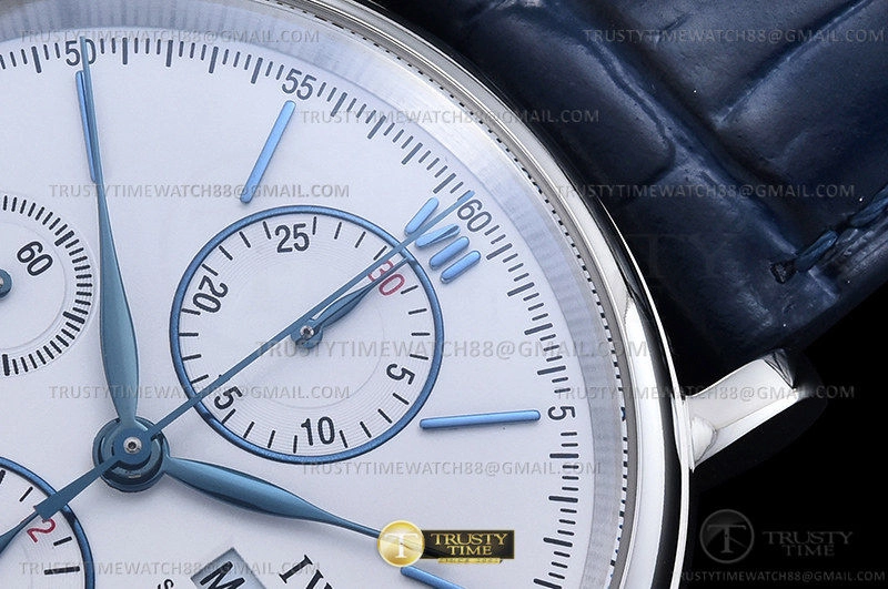 Часы IWC из коллекции Portofino Chronograph. Спортивные мужские часы IWC Portofino Chronograph 42mm IW391037 премиального качества (Артикул магазина: IW-0898) оснащены надежным автоматическим механизмом с автоподзаводом (работает от амплитуды движения руки) калибра Valjoux-7750, в котором реализованы следующие функции: часовая, минутная и секундная стрелки, а так же дата, день недели, хронограф. Круглый корпус часов стального цвета, имеющий размер 42 мм и высоту 13.6 мм превосходно дополнит образ и украсит запястье своего обладателя. Для изготовления часов IWC Portofino Chronograph 42mm IW391037 предлагаемых в нашем интернет-магазине, применяются нержавеющая сталь 316F высокого качества (Швейцарский стандарт), а так же сапфировое стекло высокой прочности, благодаря чему обеспечивается максимальная защита от сколов и механических повреждений. Отличительной чертой данной модели является белый циферблат, часовые индексы которого обеспечивают часовые метки. Завершает образ кожаный ремешок синего цвета с фирменной классической застежкой IWC. Водонепроницаемость данной модели составляет 30М (WR30) – допускается минимальное воздействие с водой.