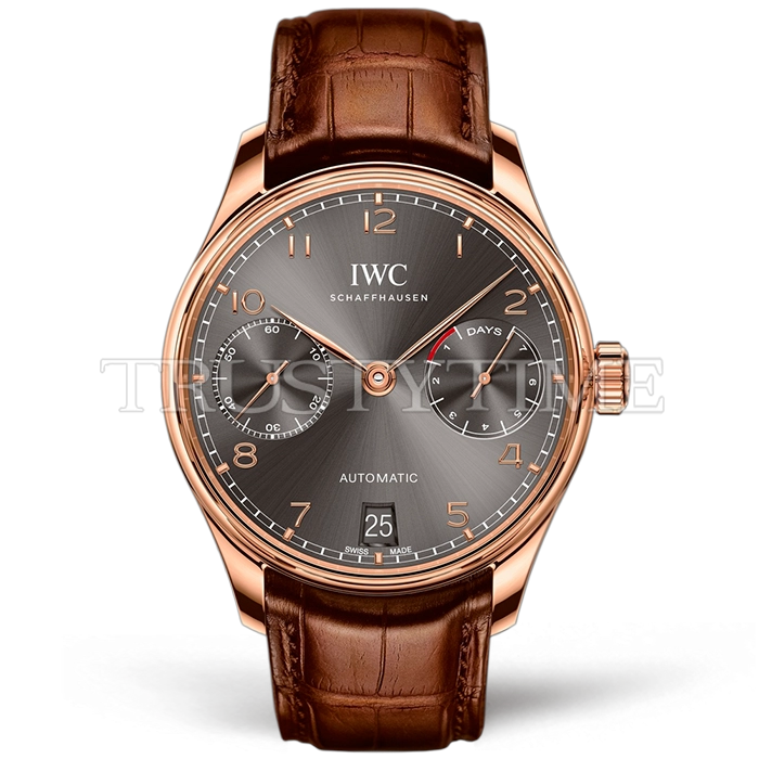Часы IWC из коллекции Portugieser. Классические мужские часы IWC Portugieser Automatic 42mm IW500702 премиального качества (Артикул магазина: IW-0847) оснащены надежным автоматическим механизмом с автоподзаводом (работает от амплитуды движения руки) калибра IWC52010, в котором реализованы следующие функции: часовая, минутная и секундная стрелки, а так же резерв хода, дата. Круглый корпус часов розового цвета, имеющий размер 42 мм и высоту 14.5 мм превосходно дополнит образ и украсит запястье своего обладателя. Для изготовления часов IWC Portugieser Automatic 42mm IW500702 предлагаемых в нашем интернет-магазине, применяются нержавеющая сталь 316L высокого качества (Швейцарский стандарт), а так же сапфировое стекло высокой прочности, благодаря чему обеспечивается максимальная защита от сколов и механических повреждений. Отличительной чертой данной модели является серый циферблат, часовые индексы которого обеспечивают арабские цифры. Завершает образ кожаный ремешок коричневого цвета с фирменной раскладывающейся застежкой IWC. Водонепроницаемость данной модели составляет 30М (WR30) – допускается минимальное воздействие с водой.