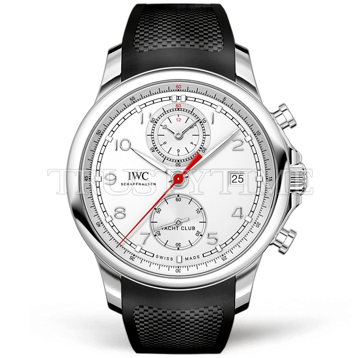 Часы IWC из коллекции Portugieser Chronograph. Спортивные мужские часы IWC Portugieser Yacht Club Chronograph 43mm IW390502 премиального качества (Артикул магазина: IW-0874) оснащены надежным автоматическим механизмом с автоподзаводом (работает от амплитуды движения руки) калибра IWC89361, в котором реализованы следующие функции: часовая, минутная и секундная стрелки, а так же хронограф, дата. Круглый корпус часов стального цвета, имеющий размер 43.5 мм и высоту 14.5 мм превосходно дополнит образ и украсит запястье своего обладателя. Для изготовления часов IWC Portugieser Yacht Club Chronograph 43mm IW390502 предлагаемых в нашем интернет-магазине, применяются нержавеющая сталь 316F высокого качества (Швейцарский стандарт), а так же сапфировое стекло высокой прочности, благодаря чему обеспечивается максимальная защита от сколов и механических повреждений. Отличительной чертой данной модели является белый циферблат, часовые индексы которого обеспечивают арабские цифры. Завершает образ каучуковый ремешок черного цвета с фирменной раскладывающейся застежкой IWC. Водонепроницаемость данной модели составляет 30М (WR30) – допускается минимальное воздействие с водой.