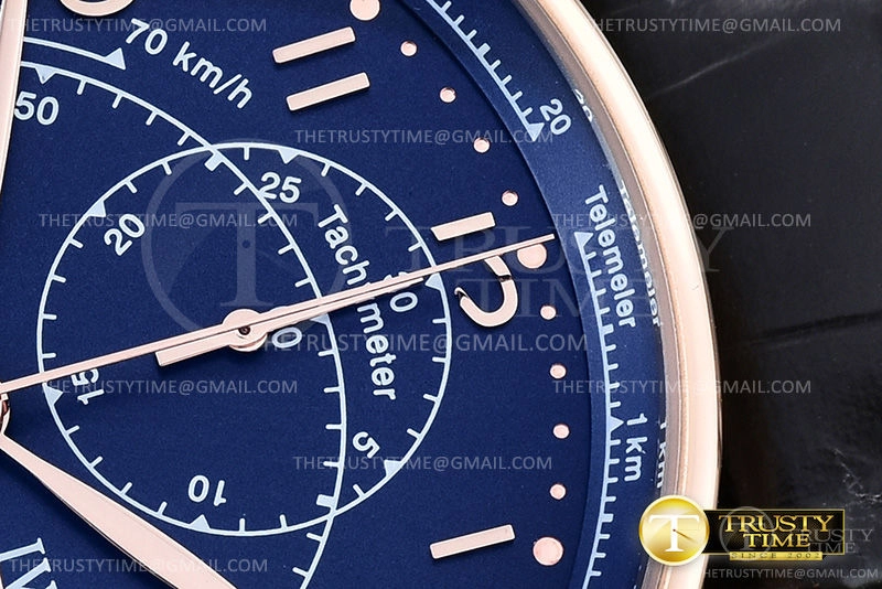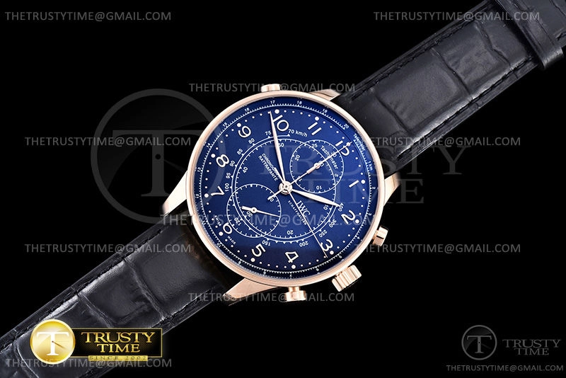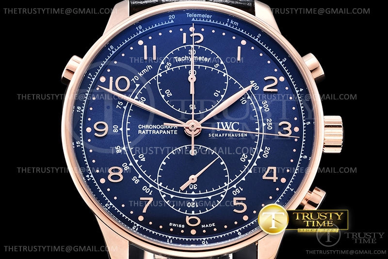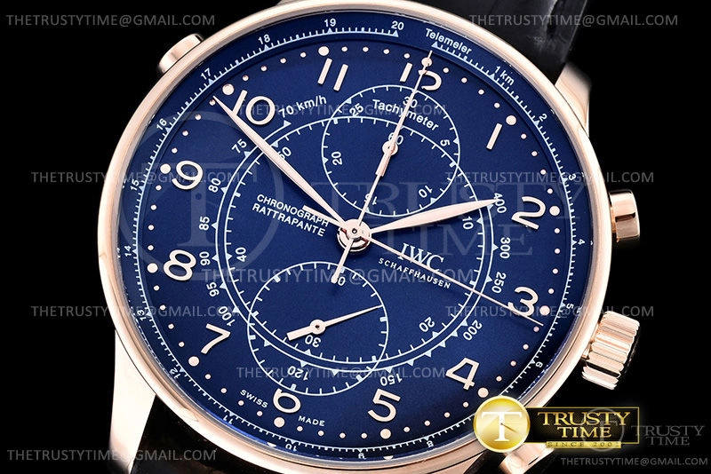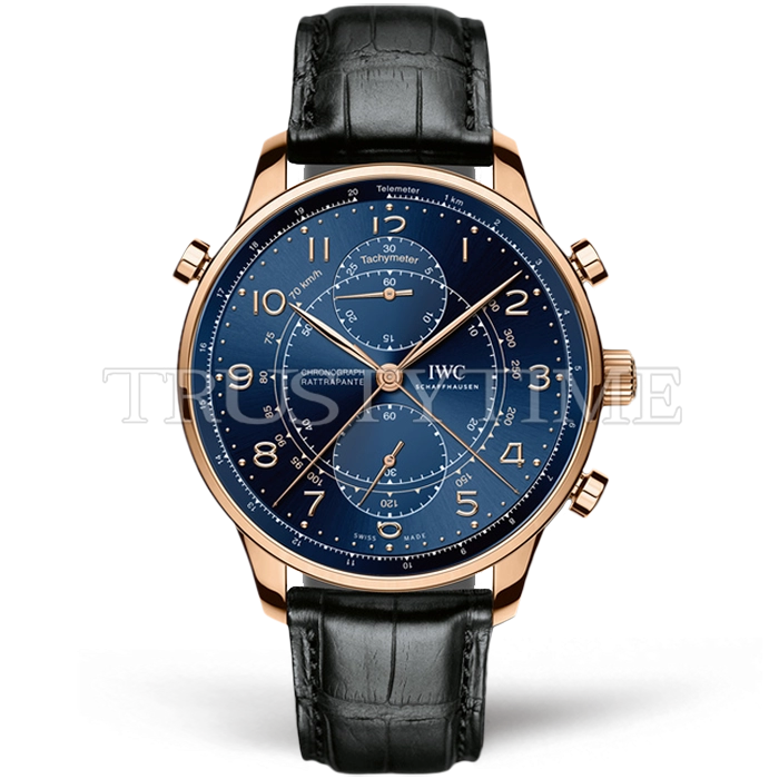 Часы IWC из коллекции Portugieser Chronograph. Спортивные мужские часы IWC Portugieser Chronograph Rattrapante 41mm IW371215 премиального качества (Артикул магазина: IW-0705) оснащены надежным автоматическим механизмом с автоподзаводом (работает от амплитуды движения руки) калибра Valjoux-7750, в котором реализованы следующие функции: часовая, минутная и секундная стрелки, а так же хронограф. Круглый корпус часов розового цвета, имеющий размер 41 мм и высоту 12.5 мм превосходно дополнит образ и украсит запястье своего обладателя. Для изготовления часов IWC Portugieser Chronograph Rattrapante 41mm IW371215 предлагаемых в нашем интернет-магазине, применяются нержавеющая сталь 316L высокого качества (Швейцарский стандарт), а так же сапфировое стекло высокой прочности, благодаря чему обеспечивается максимальная защита от сколов и механических повреждений. Отличительной чертой данной модели является синий циферблат, часовые индексы которого обеспечивают арабские цифры. Завершает образ кожаный ремешок черного цвета с фирменной раскладывающейся застежкой IWC. Водонепроницаемость данной модели составляет 30М (WR30) – допускается минимальное воздействие с водой.