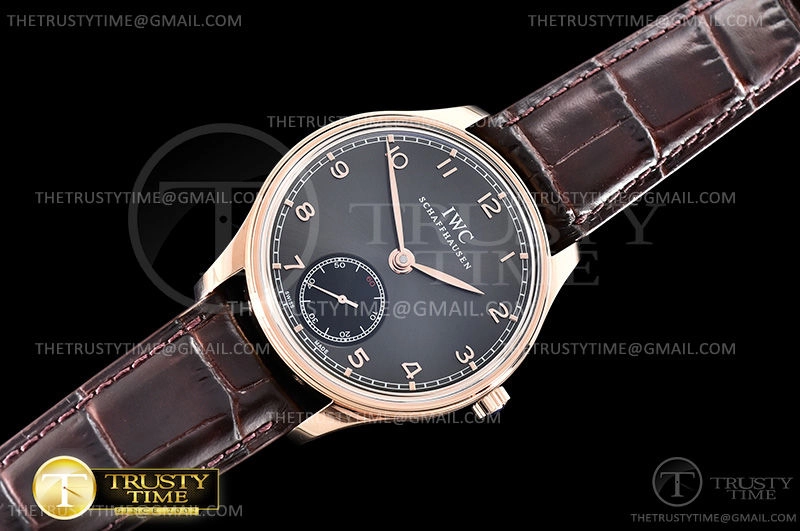 Часы IWC из коллекции Portugieser. Классические мужские часы IWC Portugieser Hand-wound 44mm IW545406 премиального качества (Артикул магазина: IW-0652) оснащены надежным автоматическим механизмом с автоподзаводом (работает от амплитуды движения руки) калибра IWC98295, в котором реализованы следующие функции: часовая, минутная и секундная стрелки, а так же максимально простой функционал без усложнений. Круглый корпус часов розового цвета, имеющий размер 44 мм и высоту 10 мм превосходно дополнит образ и украсит запястье своего обладателя. Для изготовления часов IWC Portugieser Hand-wound 44mm IW545406 предлагаемых в нашем интернет-магазине, применяются нержавеющая сталь 316L высокого качества (Швейцарский стандарт), а так же сапфировое стекло высокой прочности, благодаря чему обеспечивается максимальная защита от сколов и механических повреждений. Отличительной чертой данной модели является серый циферблат, часовые индексы которого обеспечивают арабские цифры. Завершает образ кожаный ремешок черного цвета с фирменной классической застежкой IWC. Водонепроницаемость данной модели составляет 30М (WR30) – допускается минимальное воздействие с водой.