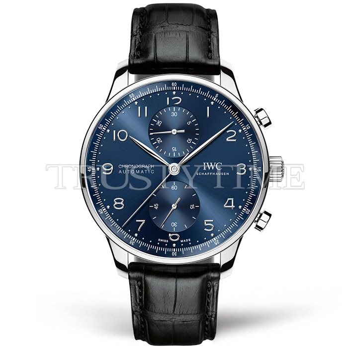 Часы IWC из коллекции Portugieser Chronograph. Спортивные мужские часы IWC Portugieser Chronograph 41mm IW371491 премиального качества (Артикул магазина: IW-0602) оснащены надежным автоматическим механизмом с автоподзаводом (работает от амплитуды движения руки) калибра IWC69355, в котором реализованы следующие функции: часовая, минутная и секундная стрелки, а так же хронограф. Круглый корпус часов стального цвета, имеющий размер 41 мм и высоту 13.1 мм превосходно дополнит образ и украсит запястье своего обладателя. Для изготовления часов IWC Portugieser Chronograph 41mm IW371491 предлагаемых в нашем интернет-магазине, применяются нержавеющая сталь 316L высокого качества (Швейцарский стандарт), а так же сапфировое стекло высокой прочности, благодаря чему обеспечивается максимальная защита от сколов и механических повреждений. Отличительной чертой данной модели является синий циферблат, часовые индексы которого обеспечивают арабские цифры. Завершает образ кожаный ремешок черного цвета с фирменной раскладывающейся застежкой IWC. Водонепроницаемость данной модели составляет 30М (WR30) – допускается минимальное воздействие с водой.