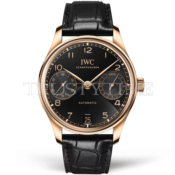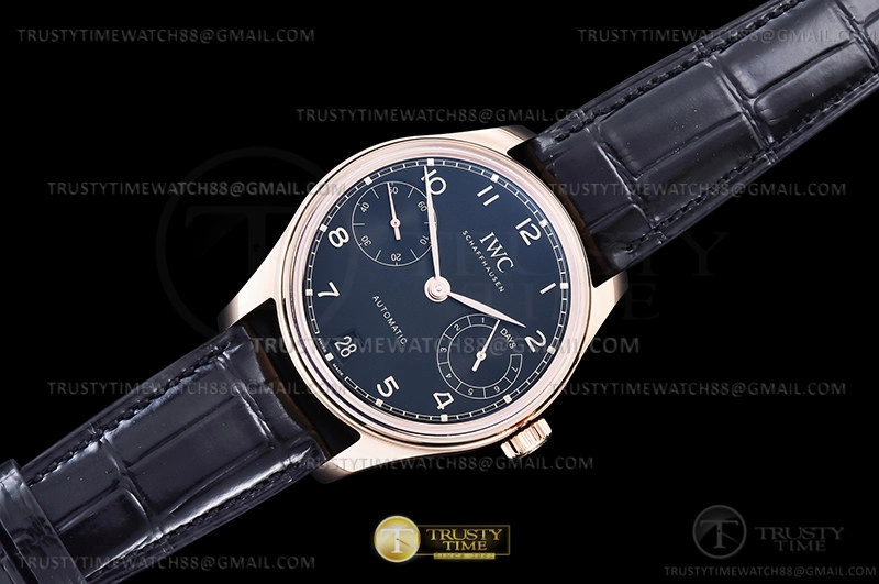Часы IWC из коллекции Portugieser. Классические мужские часы IWC Portugieser Automatic 7 Days 42mm IW501707 премиального качества (Артикул магазина: IW-0920) оснащены надежным автоматическим механизмом с автоподзаводом (работает от амплитуды движения руки) калибра IWC52010, в котором реализованы следующие функции: часовая, минутная и секундная стрелки, а так же резерв хода, дата. Круглый корпус часов розового цвета, имеющий размер 42 мм и высоту 13 мм превосходно дополнит образ и украсит запястье своего обладателя. Для изготовления часов IWC Portugieser Automatic 7 Days 42mm IW501707 предлагаемых в нашем интернет-магазине, применяются нержавеющая сталь 316L высокого качества (Швейцарский стандарт), а так же сапфировое стекло высокой прочности, благодаря чему обеспечивается максимальная защита от сколов и механических повреждений. Отличительной чертой данной модели является черный циферблат, часовые индексы которого обеспечивают арабские цифры. Завершает образ кожаный ремешок черного цвета с фирменной раскладывающейся застежкой IWC. Водонепроницаемость данной модели составляет 30М (WR30) – допускается минимальное воздействие с водой.