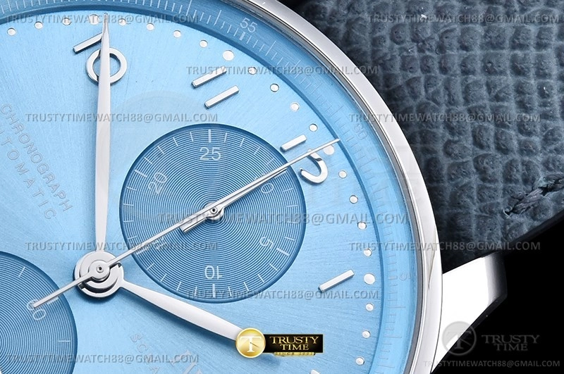 Часы IWC из коллекции Portugieser Chronograph. Классические мужские часы IWC Portugieser Chronograph 41mm IW371626 премиального качества (Артикул магазина: IW-0927) оснащены надежным автоматическим механизмом с автоподзаводом (работает от амплитуды движения руки) калибра IWC69355, в котором реализованы следующие функции: часовая, минутная и секундная стрелки, а так же хронограф. Круглый корпус часов стального цвета, имеющий размер 41 мм и высоту 13 мм превосходно дополнит образ и украсит запястье своего обладателя. Для изготовления часов IWC Portugieser Chronograph 41mm IW371626 предлагаемых в нашем интернет-магазине, применяются нержавеющая сталь 316L высокого качества (Швейцарский стандарт), а так же сапфировое стекло высокой прочности, благодаря чему обеспечивается максимальная защита от сколов и механических повреждений. Отличительной чертой данной модели является голубой циферблат, часовые индексы которого обеспечивают арабские цифры. Завершает образ кожаный ремешок синего цвета с фирменной раскладывающейся застежкой IWC. Водонепроницаемость данной модели составляет 30М (WR30) – допускается минимальное воздействие с водой.