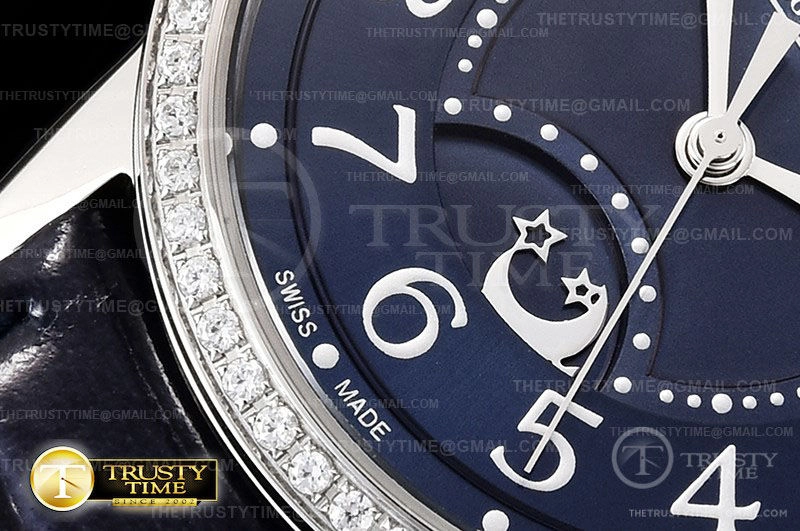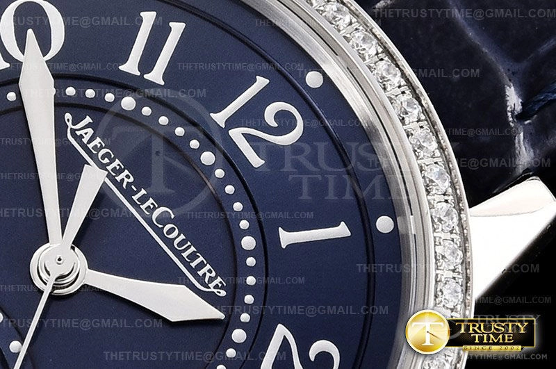 Часы Jaeger Le Coultre из коллекции Master Ultra Thin Moonphase. Классические женские часы Jaeger-LeCoultre Classic Rendez-Vous Night & Day 34mm 3448480 премиального качества (Артикул магазина: JL-0183) оснащены надежным автоматическим механизмом с автоподзаводом (работает от амплитуды движения руки) калибра 898, в котором реализованы следующие функции: часовая, минутная и секундная стрелки, а так же день-ночь. Круглый корпус часов стального цвета, имеющий размер 34 мм и высоту 8.8 мм превосходно дополнит образ и украсит запястье своего обладателя. Для изготовления часов Jaeger-LeCoultre Classic Rendez-Vous Night & Day 34mm 3448480 предлагаемых в нашем интернет-магазине, применяются нержавеющая сталь 316L высокого качества (Швейцарский стандарт), а так же сапфировое стекло высокой прочности, благодаря чему обеспечивается максимальная защита от сколов и механических повреждений. Отличительной чертой данной модели является синий циферблат, часовые индексы которого обеспечивают арабские цифры. Завершает образ кожаный ремешок синего цвета с фирменной раскладывающейся застежкой Jaeger Le Coultre. Водонепроницаемость данной модели составляет 30М (WR30) – допускается минимальное воздействие с водой.