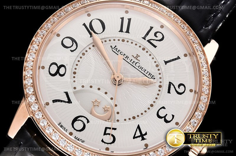 Часы Jaeger Le Coultre из коллекции Master Ultra Thin Moonphase. Классические женские часы Jaeger-LeCoultre Classic Rendez-Vous Night & Day 34mm 3442430 премиального качества (Артикул магазина: JL-0176) оснащены надежным автоматическим механизмом с автоподзаводом (работает от амплитуды движения руки) калибра 898, в котором реализованы следующие функции: часовая, минутная и секундная стрелки, а так же день-ночь. Круглый корпус часов розового цвета, имеющий размер 34 мм и высоту 8.8 мм превосходно дополнит образ и украсит запястье своего обладателя. Для изготовления часов Jaeger-LeCoultre Classic Rendez-Vous Night & Day 34mm 3442430 предлагаемых в нашем интернет-магазине, применяются нержавеющая сталь 316L высокого качества (Швейцарский стандарт), а так же сапфировое стекло высокой прочности, благодаря чему обеспечивается максимальная защита от сколов и механических повреждений. Отличительной чертой данной модели является белый циферблат, часовые индексы которого обеспечивают арабские цифры. Завершает образ кожаный ремешок черного цвета с фирменной раскладывающейся застежкой Jaeger Le Coultre. Водонепроницаемость данной модели составляет 30М (WR30) – допускается минимальное воздействие с водой.