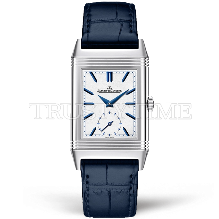 Часы Jaeger Le Coultre из коллекции Reverso. Классические мужские часы Jaeger-LeCoultre Reverso Tribute Duo 3908420 премиального качества (Артикул магазина: JL-04131) оснащены надежным автоматическим механизмом с автоподзаводом (работает от амплитуды движения руки) калибра 822, в котором реализованы следующие функции: часовая, минутная и секундная стрелки, а так же максимально простой функционал без усложнений. Прямоугольный корпус часов стального цвета, имеющий размер 30 мм X 40 мм и высоту 12 мм превосходно дополнит образ и украсит запястье своего обладателя. Для изготовления часов Jaeger-LeCoultre Reverso Tribute Duo 3908420 предлагаемых в нашем интернет-магазине, применяются нержавеющая сталь 316L высокого качества (Швейцарский стандарт), а так же сапфировое стекло высокой прочности, благодаря чему обеспечивается максимальная защита от сколов и механических повреждений. Отличительной чертой данной модели является белый циферблат, часовые индексы которого обеспечивают часовые метки. Завершает образ кожаный ремешок синего цвета с фирменной раскладывающейся застежкой Jaeger Le Coultre. Водонепроницаемость данной модели составляет 30М (WR30) – допускается минимальное воздействие с водой.