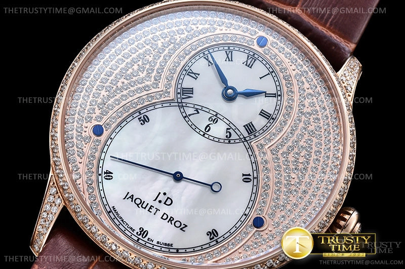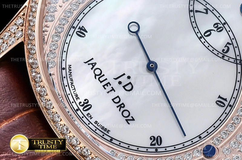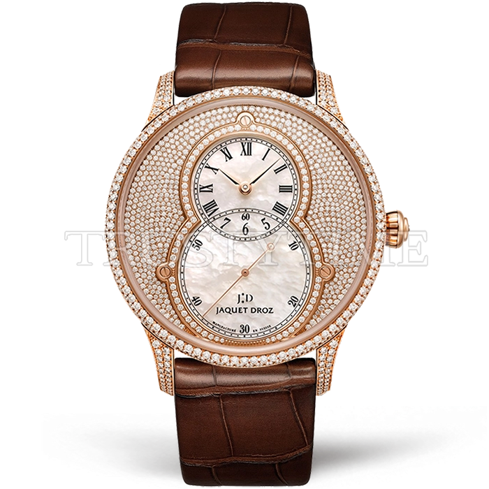 Часы Jaquet Droz из коллекции Grande Secs. Классические мужские часы Jaquet Droz Grande Seconde Diamonds Limited Edition 43mm J003033390 премиального качества (Артикул магазина: JD-0509) оснащены надежным автоматическим механизмом с автоподзаводом (работает от амплитуды движения руки) калибра ST-8003, в котором реализованы следующие функции: часовая, минутная и секундная стрелки, а так же максимально простой функционал без усложнений. Круглый корпус часов розового цвета, имеющий размер 43 мм и высоту 12 мм превосходно дополнит образ и украсит запястье своего обладателя. Для изготовления часов Jaquet Droz Grande Seconde Diamonds Limited Edition 43mm J003033390 предлагаемых в нашем интернет-магазине, применяются нержавеющая сталь 316L высокого качества (Швейцарский стандарт), а так же сапфировое стекло высокой прочности, благодаря чему обеспечивается максимальная защита от сколов и механических повреждений. Отличительной чертой данной модели является перламутровый циферблат, часовые индексы которого обеспечивают римские цифры. Завершает образ кожаный ремешок коричневого цвета с фирменной классической застежкой Jaquet Droz. Водонепроницаемость данной модели составляет 30М (WR30) – допускается минимальное воздействие с водой.
