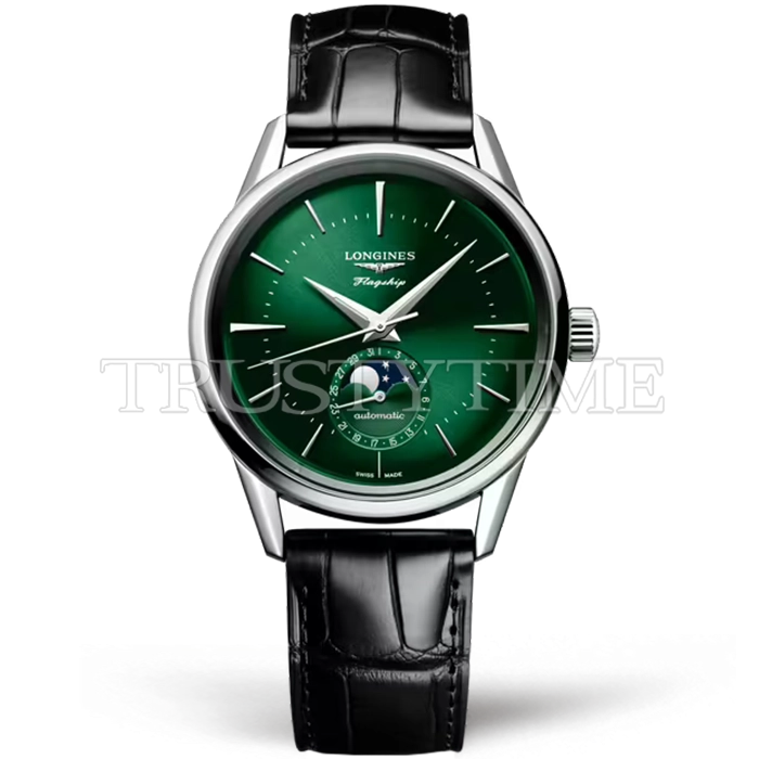 Часы Longines из коллекции Flagship Heritage. Классические мужские часы Longines Heritage Flagship Moonphase L4.815.4.02.2 премиального качества (Артикул магазина: LN-0427) оснащены надежным автоматическим механизмом с автоподзаводом (работает от амплитуды движения руки) калибра L899, в котором реализованы следующие функции: часовая, минутная и секундная стрелки, а так же дата, фаза луны. Круглый корпус часов стального цвета, имеющий размер 38.5 мм и высоту 12.5 мм превосходно дополнит образ и украсит запястье своего обладателя. Для изготовления часов Longines Heritage Flagship Moonphase L4.815.4.02.2 предлагаемых в нашем интернет-магазине, применяются нержавеющая сталь 316L высокого качества (Швейцарский стандарт), а так же сапфировое стекло высокой прочности, благодаря чему обеспечивается максимальная защита от сколов и механических повреждений. Отличительной чертой данной модели является зеленый циферблат, часовые индексы которого обеспечивают часовые метки. Завершает образ кожаный ремешок черного цвета с фирменной классической застежкой Longines. Водонепроницаемость данной модели составляет 30М (WR30) – допускается минимальное воздействие с водой.