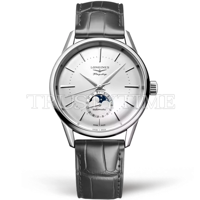 Часы Longines из коллекции Flagship Heritage. Классические мужские часы Longines Heritage Flagship Moonphase L4.815.4.72.2 премиального качества (Артикул магазина: LN-0430) оснащены надежным автоматическим механизмом с автоподзаводом (работает от амплитуды движения руки) калибра L899, в котором реализованы следующие функции: часовая, минутная и секундная стрелки, а так же дата, фаза луны. Круглый корпус часов стального цвета, имеющий размер 38.5 мм и высоту 12.5 мм превосходно дополнит образ и украсит запястье своего обладателя. Для изготовления часов Longines Heritage Flagship Moonphase L4.815.4.72.2 предлагаемых в нашем интернет-магазине, применяются нержавеющая сталь 316L высокого качества (Швейцарский стандарт), а так же сапфировое стекло высокой прочности, благодаря чему обеспечивается максимальная защита от сколов и механических повреждений. Отличительной чертой данной модели является серебристый циферблат, часовые индексы которого обеспечивают часовые метки. Завершает образ кожаный ремешок серого цвета с фирменной классической застежкой Longines. Водонепроницаемость данной модели составляет 30М (WR30) – допускается минимальное воздействие с водой.