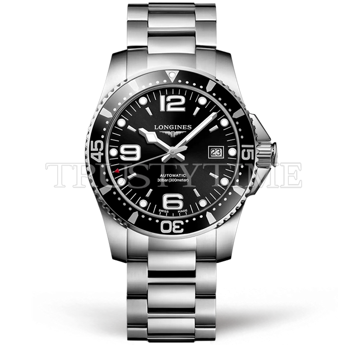 Часы Longines из коллекции HydroConquest. Классические мужские часы Longines Sport Hydroconquest 41mm L3.742.4.56.6 премиального качества (Артикул магазина: LN-0388) оснащены надежным автоматическим механизмом с автоподзаводом (работает от амплитуды движения руки) калибра ETA2824-2, в котором реализованы следующие функции: часовая, минутная и секундная стрелки, а так же дата. Круглый корпус часов стального цвета, имеющий размер 41 мм и высоту 12 мм превосходно дополнит образ и украсит запястье своего обладателя. Для изготовления часов Longines Sport Hydroconquest 41mm L3.742.4.56.6 предлагаемых в нашем интернет-магазине, применяются нержавеющая сталь 316L высокого качества (Швейцарский стандарт), а так же сапфировое стекло высокой прочности, благодаря чему обеспечивается максимальная защита от сколов и механических повреждений. Отличительной чертой данной модели является черный циферблат, часовые индексы которого обеспечивают часовые метки. Завершает образ браслет из нержавеющей стали стального цвета с фирменной раскладывающейся застежкой Longines. Водонепроницаемость данной модели составляет 30М (WR30) – допускается минимальное воздействие с водой.