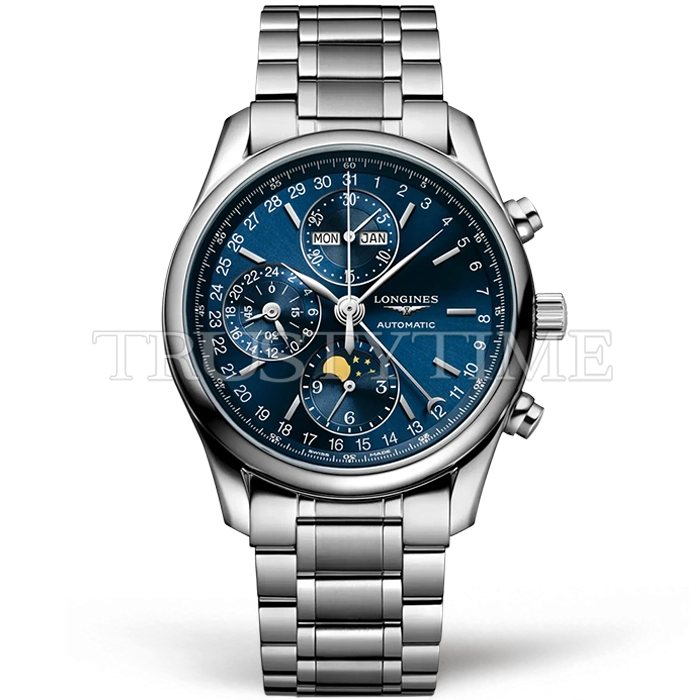 Часы Longines из коллекции Master Chronograph Calendar. Спортивные мужские часы Longines Master Collection Chronograph Calendar 40mm L2.673.4.92.6 премиального качества (Артикул магазина: LN-0352) оснащены надежным автоматическим механизмом с автоподзаводом (работает от амплитуды движения руки) калибра Valjoux-7750, в котором реализованы следующие функции: часовая, минутная и секундная стрелки, а так же дата, день недели, фаза луны, хронограф, месяц. Круглый корпус часов стального цвета, имеющий размер 40 мм и высоту 15 мм превосходно дополнит образ и украсит запястье своего обладателя. Для изготовления часов Longines Master Collection Chronograph Calendar 40mm L2.673.4.92.6 предлагаемых в нашем интернет-магазине, применяются нержавеющая сталь 316L высокого качества (Швейцарский стандарт), а так же сапфировое стекло высокой прочности, благодаря чему обеспечивается максимальная защита от сколов и механических повреждений. Отличительной чертой данной модели является синий циферблат, часовые индексы которого обеспечивают часовые метки. Завершает образ браслет из нержавеющей стали стального цвета с фирменной раскладывающейся застежкой Longines. Водонепроницаемость данной модели составляет 30М (WR30) – допускается минимальное воздействие с водой.