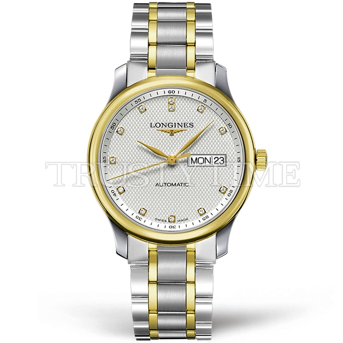 Часы Longines из коллекции Master Collection. Классические мужские часы Longines Master Collection Day Date 38mm L2.755.5.77.7 премиального качества (Артикул магазина: LN-0276) оснащены надежным автоматическим механизмом с автоподзаводом (работает от амплитуды движения руки) калибра ETA2836-2, в котором реализованы следующие функции: часовая, минутная и секундная стрелки, а так же дата, день недели. Круглый корпус часов комбинированного сталь с желтого золота цвета, имеющий размер 38.5 мм и высоту 11 мм превосходно дополнит образ и украсит запястье своего обладателя. Для изготовления часов Longines Master Collection Day Date 38mm L2.755.5.77.7 предлагаемых в нашем интернет-магазине, применяются нержавеющая сталь 316F высокого качества (Швейцарский стандарт), а так же сапфировое стекло высокой прочности, благодаря чему обеспечивается максимальная защита от сколов и механических повреждений. Отличительной чертой данной модели является серебристый циферблат, часовые индексы которого обеспечивают камни. Завершает образ браслет из нержавеющей стали комбинированного сталь с желтым золотом цвета с фирменной раскладывающейся застежкой Longines. Водонепроницаемость данной модели составляет 30М (WR30) – допускается минимальное воздействие с водой.