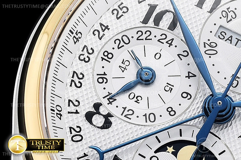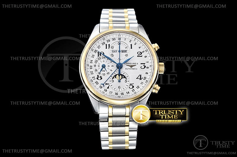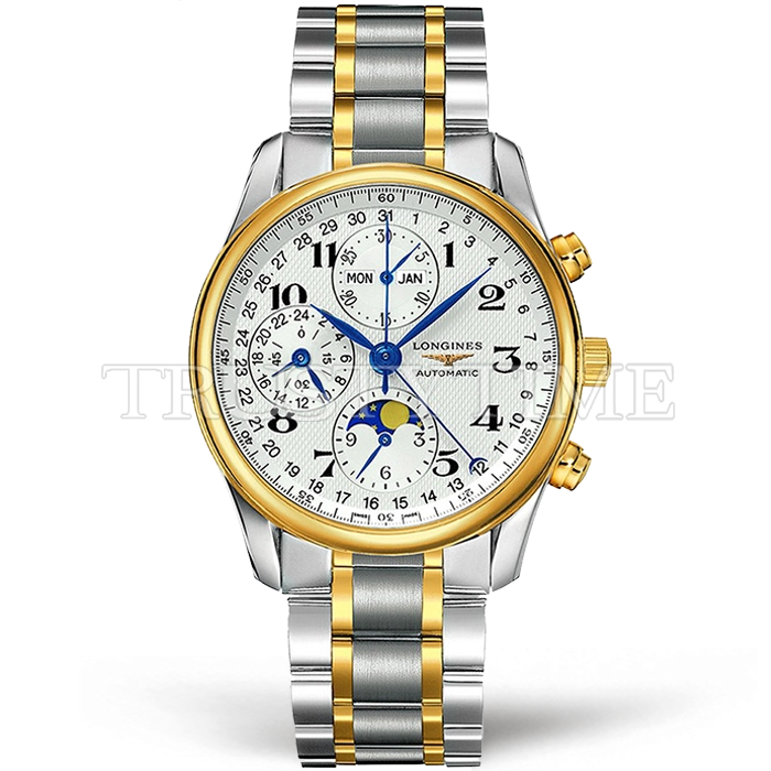 Часы Longines из коллекции Master Chronograph Calendar. Спортивные мужские часы Longines Master Collection Chronograph Calendar 40mm L2.673.5.78.7 премиального качества (Артикул магазина: LN-0287) оснащены надежным автоматическим механизмом с автоподзаводом (работает от амплитуды движения руки) калибра Valjoux-7750, в котором реализованы следующие функции: часовая, минутная и секундная стрелки, а так же дата, день недели, фаза луны, хронограф, месяц. Круглый корпус часов комбинированного сталь с желтого золота цвета, имеющий размер 40 мм и высоту 15 мм превосходно дополнит образ и украсит запястье своего обладателя. Для изготовления часов Longines Master Collection Chronograph Calendar 40mm L2.673.5.78.7 предлагаемых в нашем интернет-магазине, применяются нержавеющая сталь 316L высокого качества (Швейцарский стандарт), а так же сапфировое стекло высокой прочности, благодаря чему обеспечивается максимальная защита от сколов и механических повреждений. Отличительной чертой данной модели является серебристый циферблат, часовые индексы которого обеспечивают арабские цифры. Завершает образ браслет из нержавеющей стали комбинированного сталь с желтым золотом цвета с фирменной раскладывающейся застежкой Longines. Водонепроницаемость данной модели составляет 30М (WR30) – допускается минимальное воздействие с водой.