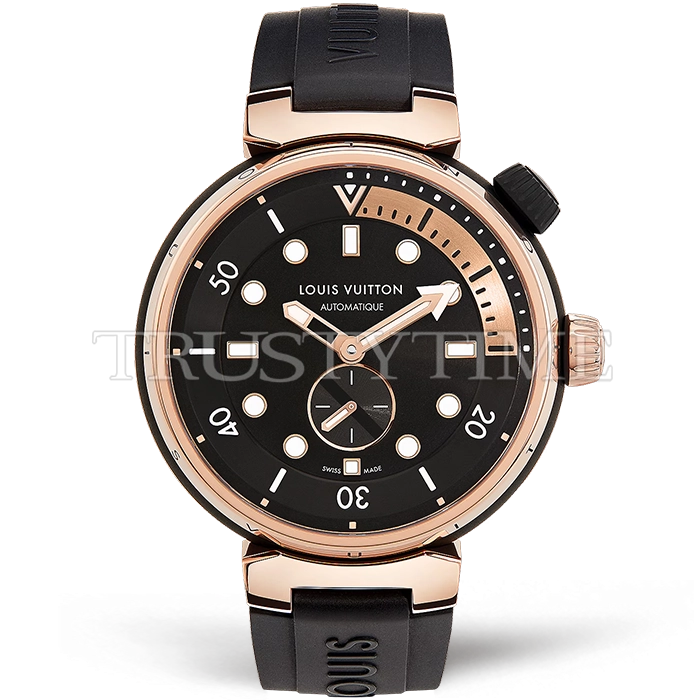 Часы Louis Vuitton из коллекции Tambour Street Diver. Спортивные женские часы Louis Vuitton Tambour Street Diver 44mm QA123A премиального качества (Артикул магазина: LV-02538) оснащены надежным автоматическим механизмом с автоподзаводом (работает от амплитуды движения руки) калибра ETA2892-2, в котором реализованы следующие функции: часовая, минутная и секундная стрелки, а так же максимально простой функционал без усложнений. Круглый корпус часов розового цвета, имеющий размер 44 мм и высоту 12.8 мм превосходно дополнит образ и украсит запястье своего обладателя. Для изготовления часов Louis Vuitton Tambour Street Diver 44mm QA123A предлагаемых в нашем интернет-магазине, применяются нержавеющая сталь 316L высокого качества (Швейцарский стандарт), а так же сапфировое стекло высокой прочности, благодаря чему обеспечивается максимальная защита от сколов и механических повреждений. Отличительной чертой данной модели является черный циферблат, часовые индексы которого обеспечивают часовые метки. Завершает образ каучуковый ремешок черного цвета с фирменной классической застежкой Louis Vuitton. Водонепроницаемость данной модели составляет 30М (WR30) – допускается минимальное воздействие с водой.