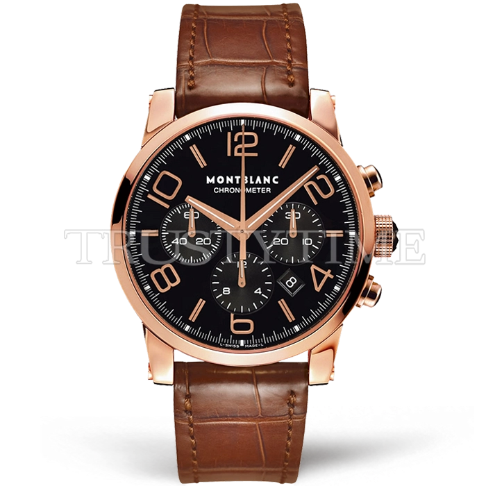 Часы Montblanc из коллекции Timewalker. Спортивные мужские часы Montblanc Timewalker Chronograph 43mm 101565 премиального качества (Артикул магазина: MB-0372) оснащены надежным автоматическим механизмом с автоподзаводом (работает от амплитуды движения руки) калибра Valjoux-7750, в котором реализованы следующие функции: часовая, минутная и секундная стрелки, а так же хронограф, дата. Круглый корпус часов розового цвета, имеющий размер 43 мм и высоту 14.5 мм превосходно дополнит образ и украсит запястье своего обладателя. Для изготовления часов Montblanc Timewalker Chronograph 43mm 101565 предлагаемых в нашем интернет-магазине, применяются нержавеющая сталь 316L высокого качества (Швейцарский стандарт), а так же сапфировое стекло высокой прочности, благодаря чему обеспечивается максимальная защита от сколов и механических повреждений. Отличительной чертой данной модели является черный циферблат, часовые индексы которого обеспечивают арабские цифры. Завершает образ кожаный ремешок коричневого цвета с фирменной раскладывающейся застежкой Montblanc. Водонепроницаемость данной модели составляет 30М (WR30) – допускается минимальное воздействие с водой.