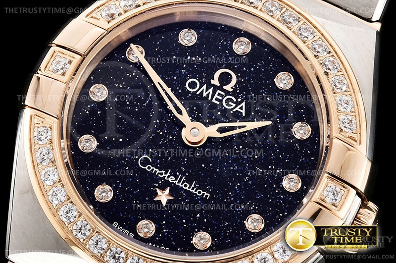 Часы Omega из коллекции Constellation. Классические женские часы Omega Constellation Quartz 25mm 131.25.25.60.53.002 премиального качества (Артикул магазина: OM-0791) оснащены надежным кварцевым механизмом (работает от батареи) калибра Swiss Quartz ETA, в котором реализованы следующие функции: часова и минутка стрелки, а так же максимально простой функционал без усложнений. Круглый корпус часов комбинированного сталь с розового золота цвета, имеющий размер 25 мм и высоту 8 мм превосходно дополнит образ и украсит запястье своего обладателя. Для изготовления часов Omega Constellation Quartz 25mm 131.25.25.60.53.002 предлагаемых в нашем интернет-магазине, применяются нержавеющая сталь 316F высокого качества (Швейцарский стандарт), а так же сапфировое стекло высокой прочности, благодаря чему обеспечивается максимальная защита от сколов и механических повреждений. Отличительной чертой данной модели является синий циферблат, часовые индексы которого обеспечивают камни. Завершает образ браслет из нержавеющей стали комбинированного сталь с розовым золотом цвета с фирменной раскладывающейся застежкой Omega. Водонепроницаемость данной модели составляет 30М (WR30) – допускается минимальное воздействие с водой.