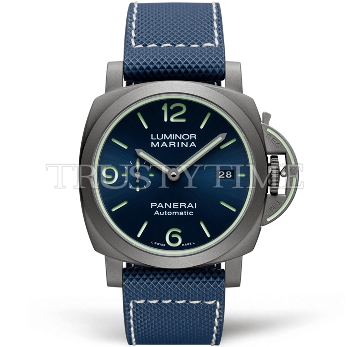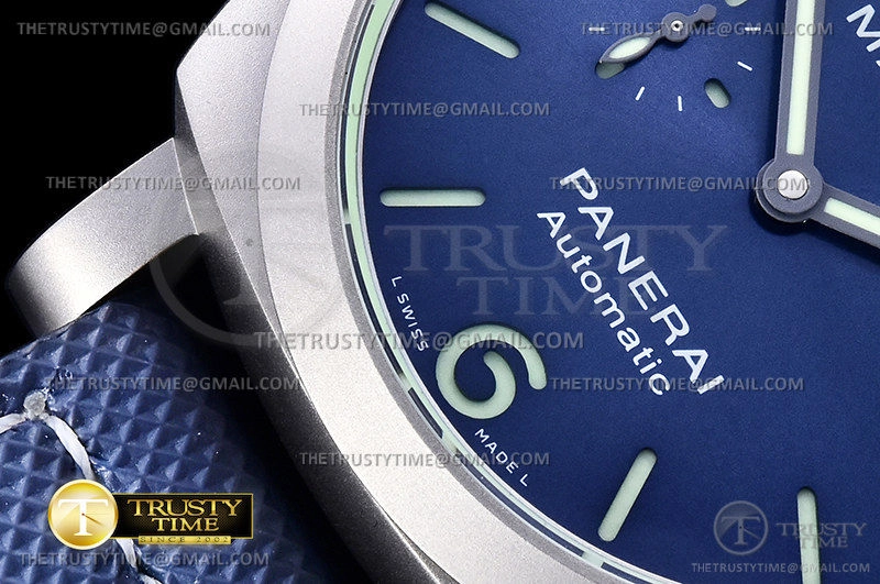 Часы Panerai из коллекции Luminor Marina. Классические мужские часы Panerai Luminor 1950 3 Days Titanium 44mm PAM01117 премиального качества (Артикул магазина: PN-0792) оснащены надежным автоматическим механизмом с автоподзаводом (работает от амплитуды движения руки) калибра P9010, в котором реализованы следующие функции: часовая, минутная и секундная стрелки, а так же дата. Круглый корпус часов серого цвета, имеющий размер 44 мм и высоту 14.5 мм превосходно дополнит образ и украсит запястье своего обладателя. Для изготовления часов Panerai Luminor 1950 3 Days Titanium 44mm PAM01117 предлагаемых в нашем интернет-магазине, применяются титан высокого качества (Швейцарский стандарт), а так же сапфировое стекло высокой прочности, благодаря чему обеспечивается максимальная защита от сколов и механических повреждений. Отличительной чертой данной модели является синий циферблат, часовые индексы которого обеспечивают часовые метки. Завершает образ нейлоновый ремешок синего цвета на липучке Panerai. Водонепроницаемость данной модели составляет 30М (WR30) – допускается минимальное воздействие с водой.