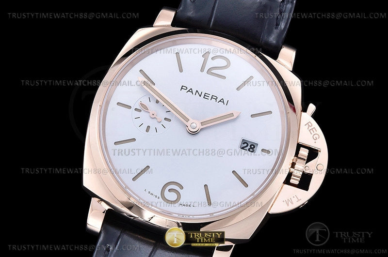 Часы Panerai из коллекции Luminor. Классические мужские часы Panerai Luminor Due Goldtech™ 42mm PAM01336 премиального качества (Артикул магазина: PN-0881) оснащены надежным автоматическим механизмом с автоподзаводом (работает от амплитуды движения руки) калибра P900, в котором реализованы следующие функции: часовая, минутная и секундная стрелки, а так же дата. Круглый корпус часов розового цвета, имеющий размер 42 мм и высоту 14 мм превосходно дополнит образ и украсит запястье своего обладателя. Для изготовления часов Panerai Luminor Due Goldtech™ 42mm PAM01336 предлагаемых в нашем интернет-магазине, применяются нержавеющая сталь 316F высокого качества (Швейцарский стандарт), а так же сапфировое стекло высокой прочности, благодаря чему обеспечивается максимальная защита от сколов и механических повреждений. Отличительной чертой данной модели является белый циферблат, часовые индексы которого обеспечивают часовые метки. Завершает образ кожаный ремешок черного цвета с фирменной классической застежкой Panerai. Водонепроницаемость данной модели составляет 30М (WR30) – допускается минимальное воздействие с водой.