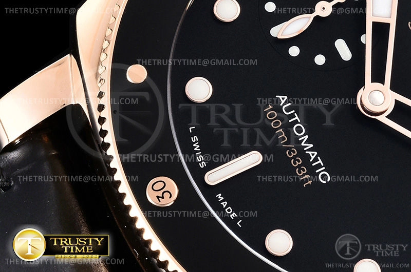 Часы Panerai из коллекции Submersible. Классические мужские часы Panerai Luminor Submersible 3 Days Automatic Goldtech 42mm PAM00974 премиального качества (Артикул магазина: PN-0752) оснащены надежным автоматическим механизмом с автоподзаводом (работает от амплитуды движения руки) калибра P900, в котором реализованы следующие функции: часовая, минутная и секундная стрелки, а так же дата. Круглый корпус часов розового цвета, имеющий размер 42 мм и высоту 14.5 мм превосходно дополнит образ и украсит запястье своего обладателя. Для изготовления часов Panerai Luminor Submersible 3 Days Automatic Goldtech 42mm PAM00974 предлагаемых в нашем интернет-магазине, применяются нержавеющая сталь 316F высокого качества (Швейцарский стандарт), а так же сапфировое стекло высокой прочности, благодаря чему обеспечивается максимальная защита от сколов и механических повреждений. Отличительной чертой данной модели является черный циферблат, часовые индексы которого обеспечивают часовые метки. Завершает образ кожаный ремешок черного цвета с фирменной классической застежкой Panerai. Водонепроницаемость данной модели составляет 30М (WR30) – допускается минимальное воздействие с водой.