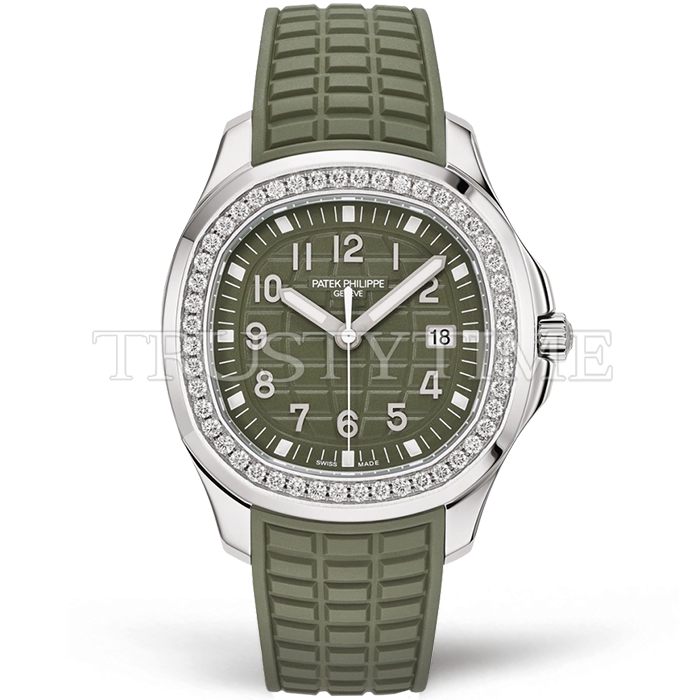 Часы Patek Philippe из коллекции Aquanaut Luce. Классические женские часы Patek Philippe Aquanaut Luce 38.8mm 5267/200A-011 премиального качества (Артикул магазина: PP-0821) оснащены надежным кварцевым механизмом (работает от батареи) калибра Swiss Quartz ETA, в котором реализованы следующие функции: часовая, минутная и секундная стрелки, а так же дата. Восьмиугольный корпус часов стального цвета, имеющий размер 38.8 мм и высоту 8 мм превосходно дополнит образ и украсит запястье своего обладателя. Для изготовления часов Patek Philippe Aquanaut Luce 38.8mm 5267/200A-011 предлагаемых в нашем интернет-магазине, применяются нержавеющая сталь 316F высокого качества (Швейцарский стандарт), а так же сапфировое стекло высокой прочности, благодаря чему обеспечивается максимальная защита от сколов и механических повреждений. Отличительной чертой данной модели является зеленый циферблат, часовые индексы которого обеспечивают арабские цифры. Завершает образ каучуковый ремешок зеленого цвета с фирменной раскладывающейся застежкой Patek Philippe. Водонепроницаемость данной модели составляет 30М (WR30) – допускается минимальное воздействие с водой.