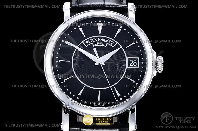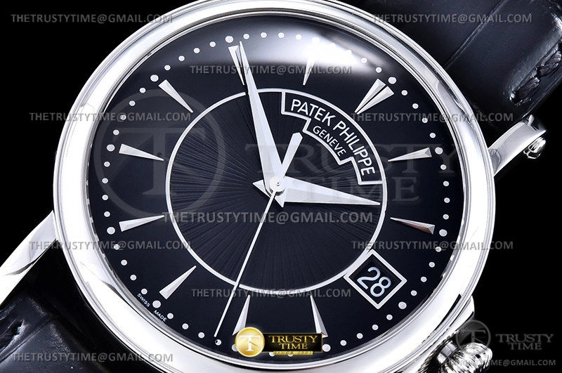 Часы Patek Philippe из коллекции Calatrava. Классические мужские часы Patek Philippe Calatrava 38mm 5153G-001 премиального качества (Артикул магазина: PP-0685) оснащены надежным автоматическим механизмом с автоподзаводом (работает от амплитуды движения руки) калибра PP324SC, в котором реализованы следующие функции: часовая, минутная и секундная стрелки, а так же дата. Круглый корпус часов стального цвета, имеющий размер 38 мм и высоту 11 мм превосходно дополнит образ и украсит запястье своего обладателя. Для изготовления часов Patek Philippe Calatrava 38mm 5153G-001 предлагаемых в нашем интернет-магазине, применяются нержавеющая сталь 316F высокого качества (Швейцарский стандарт), а так же сапфировое стекло высокой прочности, благодаря чему обеспечивается максимальная защита от сколов и механических повреждений. Отличительной чертой данной модели является черный циферблат, часовые индексы которого обеспечивают часовые метки. Завершает образ кожаный ремешок черного цвета с фирменной раскладывающейся застежкой Patek Philippe. Водонепроницаемость данной модели составляет 30М (WR30) – допускается минимальное воздействие с водой.