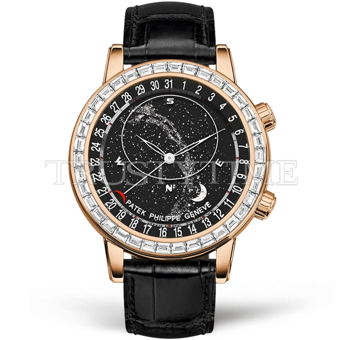 Часы Patek Philippe из коллекции Grand Complications. Классические мужские часы Patek Philippe Grand Complications Celestial Sky Moon 44mm 6104R-001 премиального качества (Артикул магазина: PP-0446) оснащены надежным автоматическим механизмом с автоподзаводом (работает от амплитуды движения руки) калибра PP240, в котором реализованы следующие функции: часова и минутка стрелки, а так же дата, день-ночь. Круглый корпус часов розового цвета, имеющий размер 44 мм и высоту 11.5 мм превосходно дополнит образ и украсит запястье своего обладателя. Для изготовления часов Patek Philippe Grand Complications Celestial Sky Moon 44mm 6104R-001 предлагаемых в нашем интернет-магазине, применяются нержавеющая сталь 316F высокого качества (Швейцарский стандарт), а так же сапфировое стекло высокой прочности, благодаря чему обеспечивается максимальная защита от сколов и механических повреждений. Отличительной чертой данной модели является черный циферблат, без меток и цифр. Завершает образ кожаный ремешок черного цвета с фирменной раскладывающейся застежкой Patek Philippe. Водонепроницаемость данной модели составляет 30М (WR30) – допускается минимальное воздействие с водой.