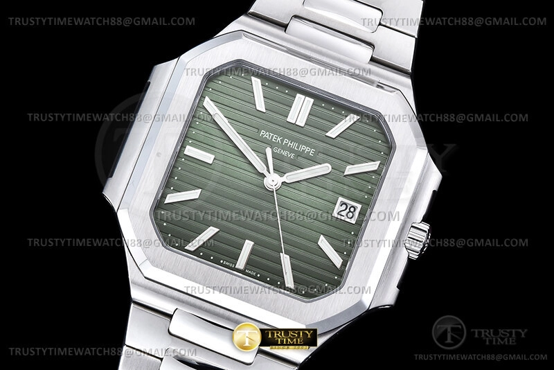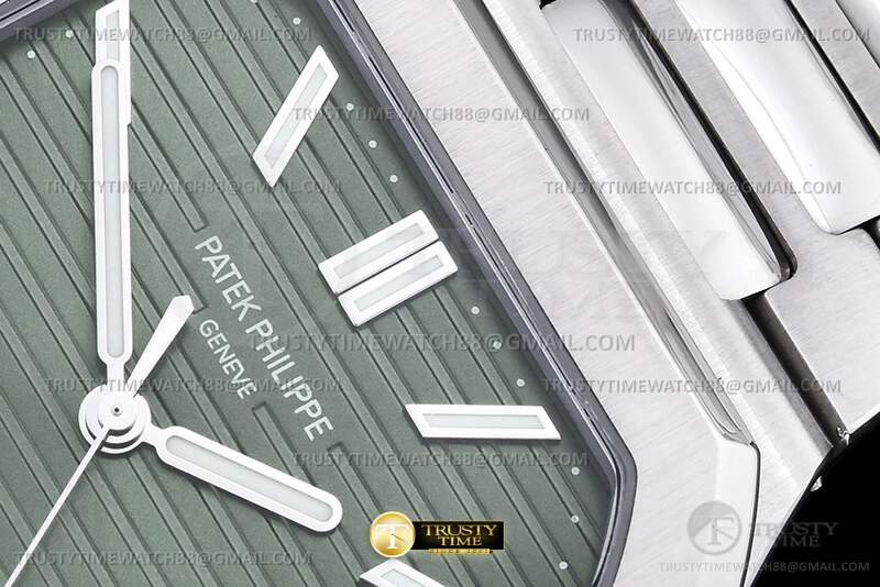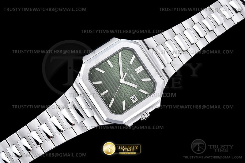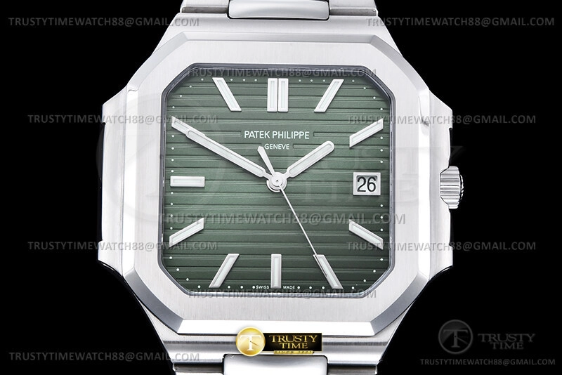 Часы Patek Philippe из коллекции Cubitus. Классические мужские часы Patek Philippe Cubitus 5821/1A-001 премиального качества (Артикул магазина: PP-0834) оснащены надежным автоматическим механизмом с автоподзаводом (работает от амплитуды движения руки) калибра PP26-330SC, в котором реализованы следующие функции: часовая, минутная и секундная стрелки, а так же дата. Квадратный корпус часов стального цвета, имеющий размер 45 мм и высоту 8.3 мм превосходно дополнит образ и украсит запястье своего обладателя. Для изготовления часов Patek Philippe Cubitus 5821/1A-001 предлагаемых в нашем интернет-магазине, применяются нержавеющая сталь 316F высокого качества (Швейцарский стандарт), а так же сапфировое стекло высокой прочности, благодаря чему обеспечивается максимальная защита от сколов и механических повреждений. Отличительной чертой данной модели является зеленый циферблат, часовые индексы которого обеспечивают часовые метки. Завершает образ браслет из нержавеющей стали стального цвета с фирменной раскладывающейся застежкой Patek Philippe. Водонепроницаемость данной модели составляет 30М (WR30) – допускается минимальное воздействие с водой.