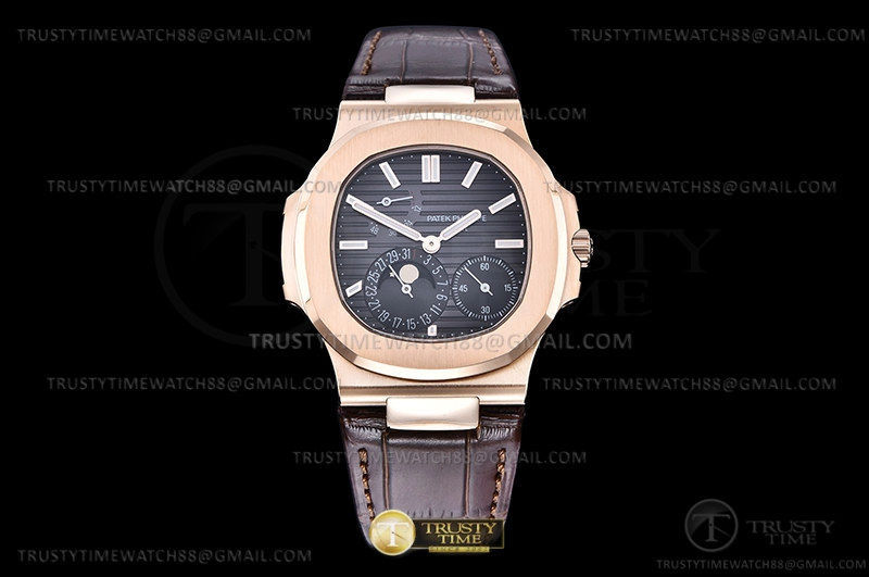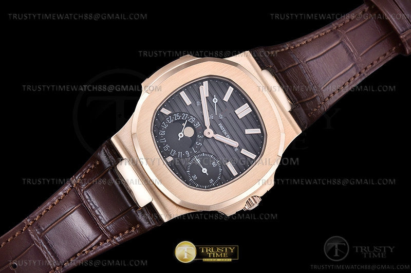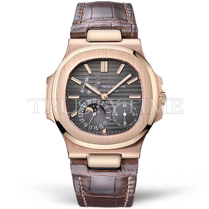 Часы Patek Philippe из коллекции Nautilus Power Reserve. Классические мужские часы Patek Philippe Nautilus Power Reserve Moonphase 40mm 5712R-001 премиального качества (Артикул магазина: PP-0742) оснащены надежным автоматическим механизмом с автоподзаводом (работает от амплитуды движения руки) калибра PP240, в котором реализованы следующие функции: часовая, минутная и секундная стрелки, а так же резерв хода, дата, фаза луны. Восьмиугольный корпус часов розового цвета, имеющий размер 40 мм и высоту 10.5 мм превосходно дополнит образ и украсит запястье своего обладателя. Для изготовления часов Patek Philippe Nautilus Power Reserve Moonphase 40mm 5712R-001 предлагаемых в нашем интернет-магазине, применяются нержавеющая сталь 316L высокого качества (Швейцарский стандарт), а так же сапфировое стекло высокой прочности, благодаря чему обеспечивается максимальная защита от сколов и механических повреждений. Отличительной чертой данной модели является серый циферблат, часовые индексы которого обеспечивают часовые метки. Завершает образ кожаный ремешок коричневого цвета с фирменной раскладывающейся застежкой Patek Philippe. Водонепроницаемость данной модели составляет 30М (WR30) – допускается минимальное воздействие с водой.