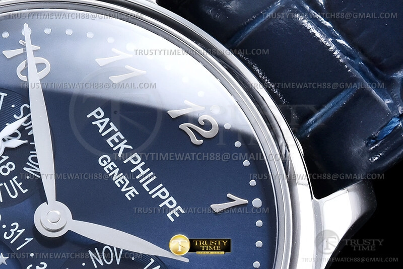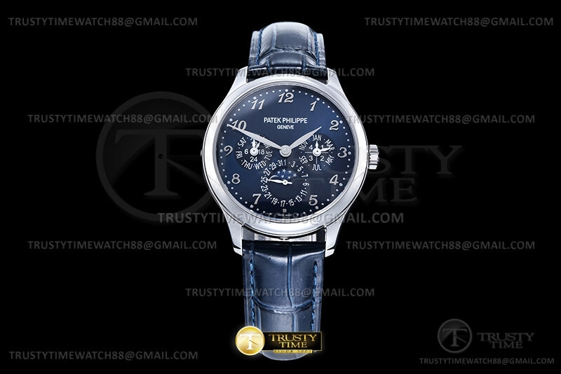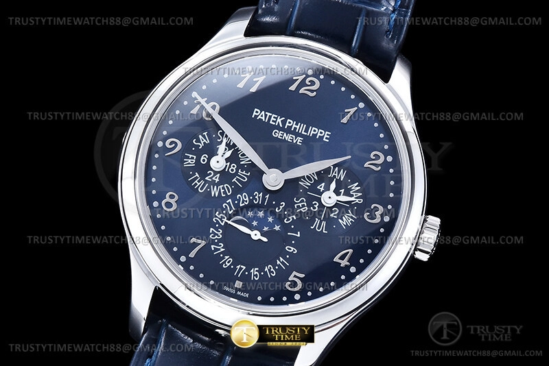 Часы Patek Philippe из коллекции Complications Perpetual Calendar. Классические мужские часы Patek Philippe Perpetual Calendar 5327G-001 премиального качества (Артикул магазина: PP-0838) оснащены надежным автоматическим механизмом с автоподзаводом (работает от амплитуды движения руки) калибра PP240, в котором реализованы следующие функции: часова и минутка стрелки, а так же дата, день недели, день-ночь, фаза луны, месяц, високосный год. Круглый корпус часов стального цвета, имеющий размер 39 мм и высоту 12.5 мм превосходно дополнит образ и украсит запястье своего обладателя. Для изготовления часов Patek Philippe Perpetual Calendar 5327G-001 предлагаемых в нашем интернет-магазине, применяются нержавеющая сталь 316L высокого качества (Швейцарский стандарт), а так же сапфировое стекло высокой прочности, благодаря чему обеспечивается максимальная защита от сколов и механических повреждений. Отличительной чертой данной модели является синий циферблат, часовые индексы которого обеспечивают арабские цифры. Завершает образ кожаный ремешок синего цвета с фирменной раскладывающейся застежкой Patek Philippe. Водонепроницаемость данной модели составляет 30М (WR30) – допускается минимальное воздействие с водой.