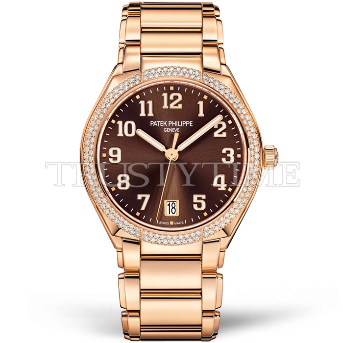 Часы Patek Philippe из коллекции Twenty-4. Классические женские часы Patek Philippe Twenty-4 Automatic 36mm 7300/1200R-001 премиального качества (Артикул магазина: PP-0814) оснащены надежным автоматическим механизмом с автоподзаводом (работает от амплитуды движения руки) калибра PP324CS, в котором реализованы следующие функции: часовая, минутная и секундная стрелки, а так же дата. Круглый корпус часов розового цвета, имеющий размер 36 мм и высоту 10.4 мм превосходно дополнит образ и украсит запястье своего обладателя. Для изготовления часов Patek Philippe Twenty-4 Automatic 36mm 7300/1200R-001 предлагаемых в нашем интернет-магазине, применяются нержавеющая сталь 316F высокого качества (Швейцарский стандарт), а так же сапфировое стекло высокой прочности, благодаря чему обеспечивается максимальная защита от сколов и механических повреждений. Отличительной чертой данной модели является коричневый циферблат, часовые индексы которого обеспечивают арабские цифры. Завершает образ браслет из нержавеющей стали цвета розового золота с фирменной раскладывающейся застежкой Patek Philippe. Водонепроницаемость данной модели составляет 30М (WR30) – допускается минимальное воздействие с водой.