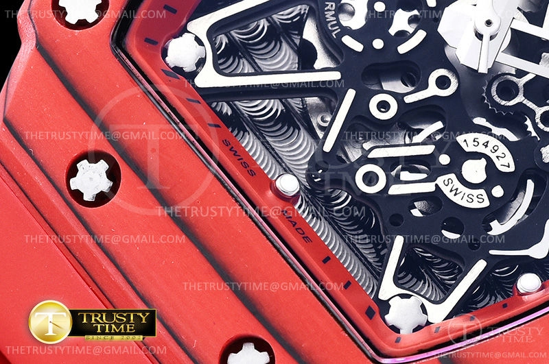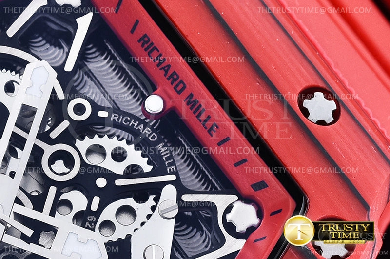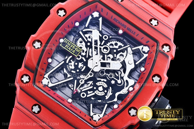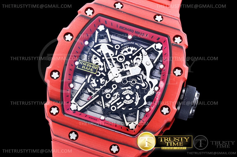 Часы Richard Mille из коллекции RM035. Спортивные мужские часы Richard Mille RM035-02 Rafael Nadal премиального качества (Артикул магазина: RM-0398) оснащены надежным автоматическим механизмом с автоподзаводом (работает от амплитуды движения руки) калибра M-6T51, в котором реализованы следующие функции: часовая, минутная и секундная стрелки, а так же максимально простой функционал без усложнений. Бочкообразный корпус часов красного цвета, имеющий размер 43 мм X 50 мм и высоту 17.5 мм превосходно дополнит образ и украсит запястье своего обладателя. Для изготовления часов Richard Mille RM035-02 Rafael Nadal предлагаемых в нашем интернет-магазине, применяются кованый карбон высокого качества (Швейцарский стандарт), а так же сапфировое стекло высокой прочности, благодаря чему обеспечивается максимальная защита от сколов и механических повреждений. Отличительной чертой данной модели является скелетонизированный циферблат, часовые индексы которого обеспечивают часовые метки. Завершает образ каучуковый ремешок красного цвета с фирменной раскладывающейся застежкой Richard Mille. Водонепроницаемость данной модели составляет 30М (WR30) – допускается минимальное воздействие с водой.