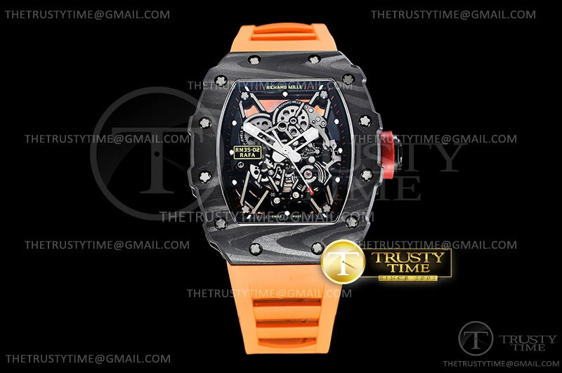 Часы Richard Mille из коллекции RM035. Спортивные мужские часы Richard Mille RM035-02 Rafael Nadal премиального качества (Артикул магазина: RM-0363) оснащены надежным автоматическим механизмом с автоподзаводом (работает от амплитуды движения руки) калибра MY9015, в котором реализованы следующие функции: часовая, минутная и секундная стрелки, а так же максимально простой функционал без усложнений. Бочкообразный корпус часов черного цвета, имеющий размер 43 мм и высоту 17.5 мм превосходно дополнит образ и украсит запястье своего обладателя. Для изготовления часов Richard Mille RM035-02 Rafael Nadal предлагаемых в нашем интернет-магазине, применяются кованый карбон высокого качества (Швейцарский стандарт), а так же сапфировое стекло высокой прочности, благодаря чему обеспечивается максимальная защита от сколов и механических повреждений. Отличительной чертой данной модели является скелетонизированный циферблат, часовые индексы которого обеспечивают часовые метки. Завершает образ каучуковый ремешок оранжевого цвета с фирменной раскладывающейся застежкой Richard Mille. Водонепроницаемость данной модели составляет 30М (WR30) – допускается минимальное воздействие с водой.