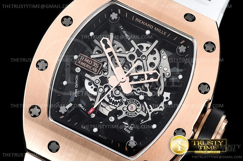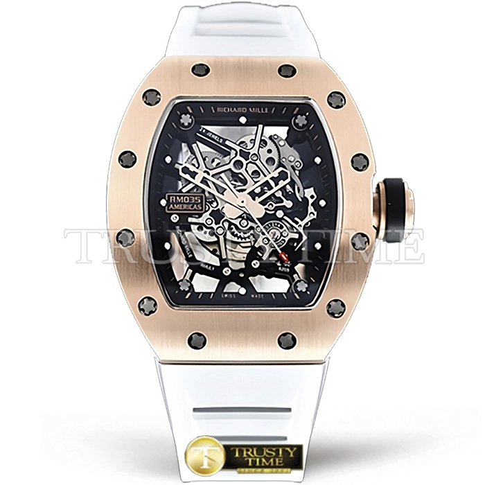 Часы Richard Mille из коллекции RM035. Спортивные мужские часы Richard Mille RM035-02 Americas Skeleton премиального качества (Артикул магазина: RM-0347) оснащены надежным автоматическим механизмом с автоподзаводом (работает от амплитуды движения руки) калибра MY8215, в котором реализованы следующие функции: часовая, минутная и секундная стрелки, а так же максимально простой функционал без усложнений. Бочкообразный корпус часов розового цвета, имеющий размер 43 мм X 50 мм и высоту 16.5 мм превосходно дополнит образ и украсит запястье своего обладателя. Для изготовления часов Richard Mille RM035-02 Americas Skeleton предлагаемых в нашем интернет-магазине, применяются нержавеющая сталь 316F высокого качества (Швейцарский стандарт), а так же сапфировое стекло высокой прочности, благодаря чему обеспечивается максимальная защита от сколов и механических повреждений. Отличительной чертой данной модели является скелетонизированный циферблат, часовые индексы которого обеспечивают часовые метки. Завершает образ каучуковый ремешок белого цвета с фирменной раскладывающейся застежкой Richard Mille. Водонепроницаемость данной модели составляет 30М (WR30) – допускается минимальное воздействие с водой.