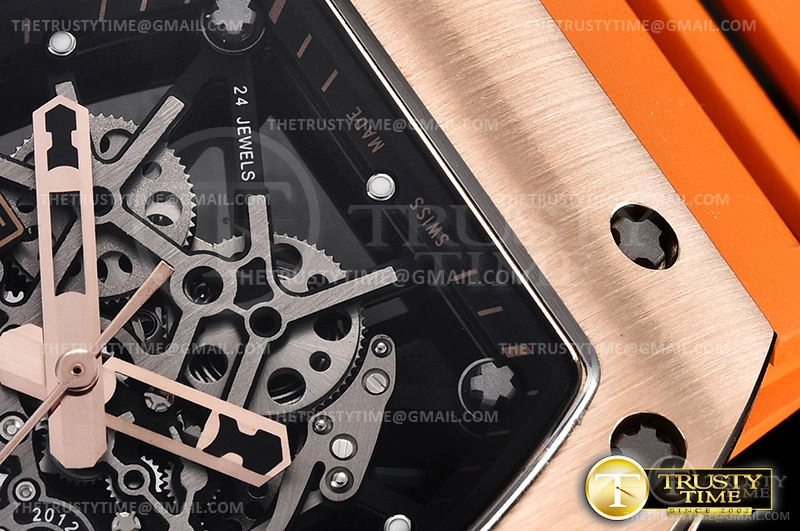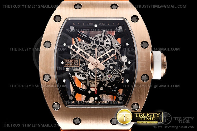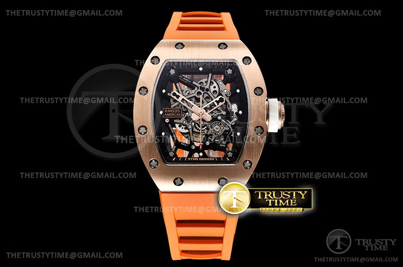 Часы Richard Mille из коллекции RM035. Спортивные мужские часы Richard Mille RM035 Americas Skeleton премиального качества (Артикул магазина: RM-0337) оснащены надежным автоматическим механизмом с автоподзаводом (работает от амплитуды движения руки) калибра MY8215, в котором реализованы следующие функции: часовая, минутная и секундная стрелки, а так же максимально простой функционал без усложнений. Бочкообразный корпус часов розового цвета, имеющий размер 43 мм X 50 мм и высоту 16.5 мм превосходно дополнит образ и украсит запястье своего обладателя. Для изготовления часов Richard Mille RM035 Americas Skeleton предлагаемых в нашем интернет-магазине, применяются нержавеющая сталь 316F высокого качества (Швейцарский стандарт), а так же сапфировое стекло высокой прочности, благодаря чему обеспечивается максимальная защита от сколов и механических повреждений. Отличительной чертой данной модели является скелетонизированный циферблат, часовые индексы которого обеспечивают часовые метки. Завершает образ каучуковый ремешок оранжевого цвета с фирменной раскладывающейся застежкой Richard Mille. Водонепроницаемость данной модели составляет 30М (WR30) – допускается минимальное воздействие с водой.