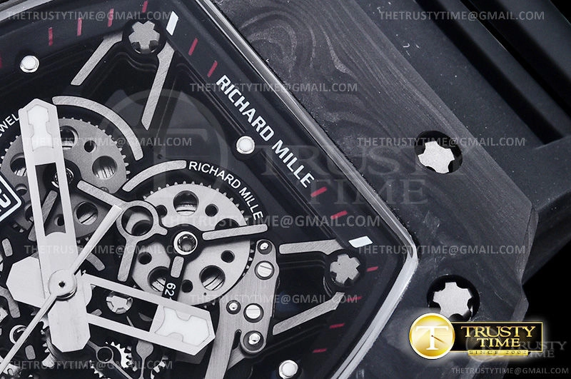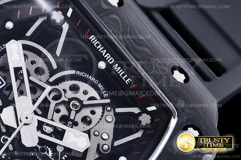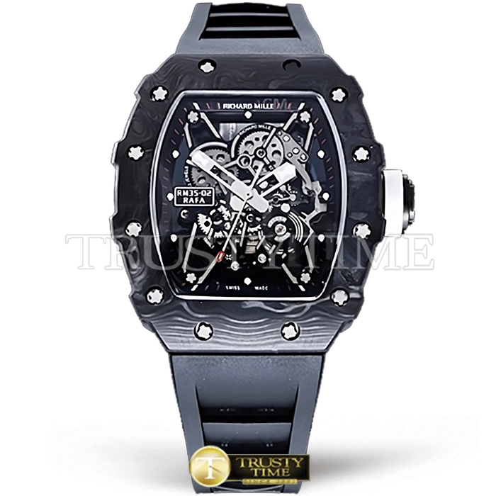 Часы Richard Mille из коллекции RM035. Спортивные мужские часы Richard Mille RM035-02 Rafael Nadal премиального качества (Артикул магазина: RM-0329) оснащены надежным автоматическим механизмом с автоподзаводом (работает от амплитуды движения руки) калибра MY8215, в котором реализованы следующие функции: часовая, минутная и секундная стрелки, а так же максимально простой функционал без усложнений. Бочкообразный корпус часов черного цвета, имеющий размер 42 мм X 50 мм и высоту 17 мм превосходно дополнит образ и украсит запястье своего обладателя. Для изготовления часов Richard Mille RM035-02 Rafael Nadal предлагаемых в нашем интернет-магазине, применяются кованый карбон высокого качества (Швейцарский стандарт), а так же сапфировое стекло высокой прочности, благодаря чему обеспечивается максимальная защита от сколов и механических повреждений. Отличительной чертой данной модели является скелетонизированный циферблат, часовые индексы которого обеспечивают часовые метки. Завершает образ каучуковый ремешок черного цвета с фирменной раскладывающейся застежкой Richard Mille. Водонепроницаемость данной модели составляет 30М (WR30) – допускается минимальное воздействие с водой.