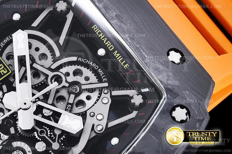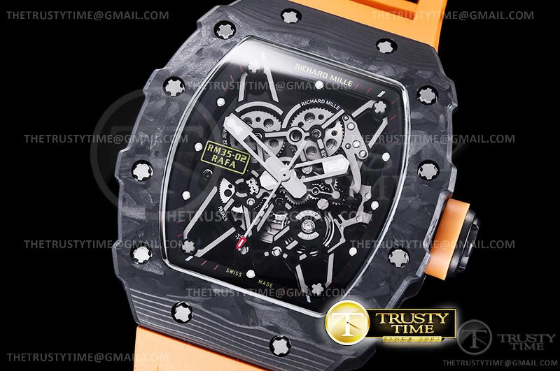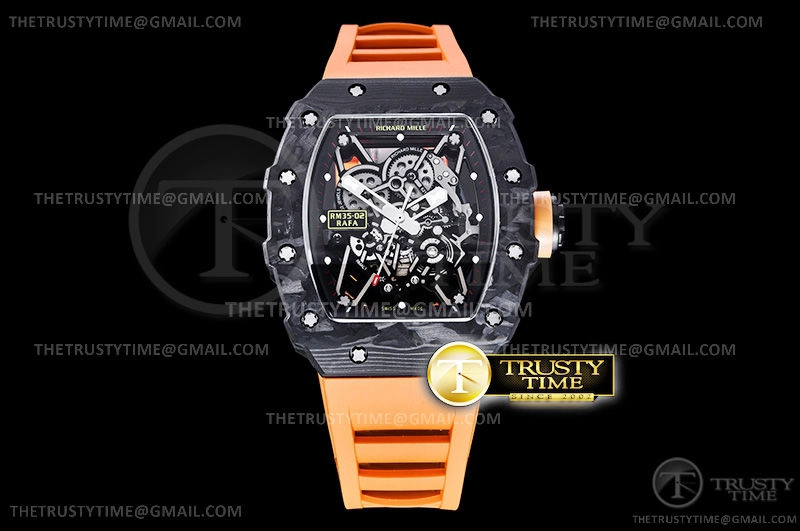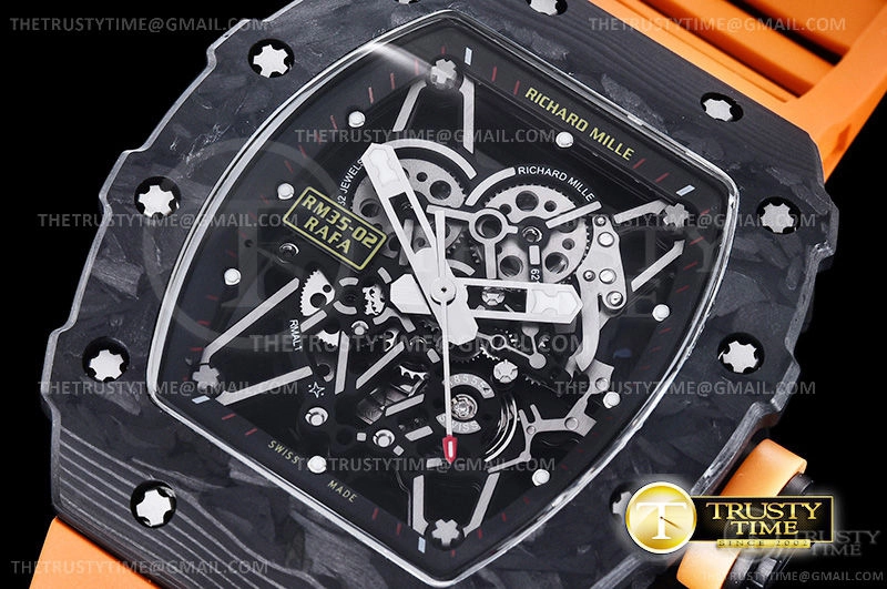 Часы Richard Mille из коллекции RM035. Спортивные мужские часы Richard Mille RM035-02 Rafael Nadal премиального качества (Артикул магазина: RM-0332) оснащены надежным автоматическим механизмом с автоподзаводом (работает от амплитуды движения руки) калибра MY8215, в котором реализованы следующие функции: часовая, минутная и секундная стрелки, а так же максимально простой функционал без усложнений. Бочкообразный корпус часов черного цвета, имеющий размер 42 мм X 50 мм и высоту 17 мм превосходно дополнит образ и украсит запястье своего обладателя. Для изготовления часов Richard Mille RM035-02 Rafael Nadal предлагаемых в нашем интернет-магазине, применяются кованый карбон высокого качества (Швейцарский стандарт), а так же сапфировое стекло высокой прочности, благодаря чему обеспечивается максимальная защита от сколов и механических повреждений. Отличительной чертой данной модели является скелетонизированный циферблат, часовые индексы которого обеспечивают часовые метки. Завершает образ каучуковый ремешок оранжевого цвета с фирменной раскладывающейся застежкой Richard Mille. Водонепроницаемость данной модели составляет 30М (WR30) – допускается минимальное воздействие с водой.
