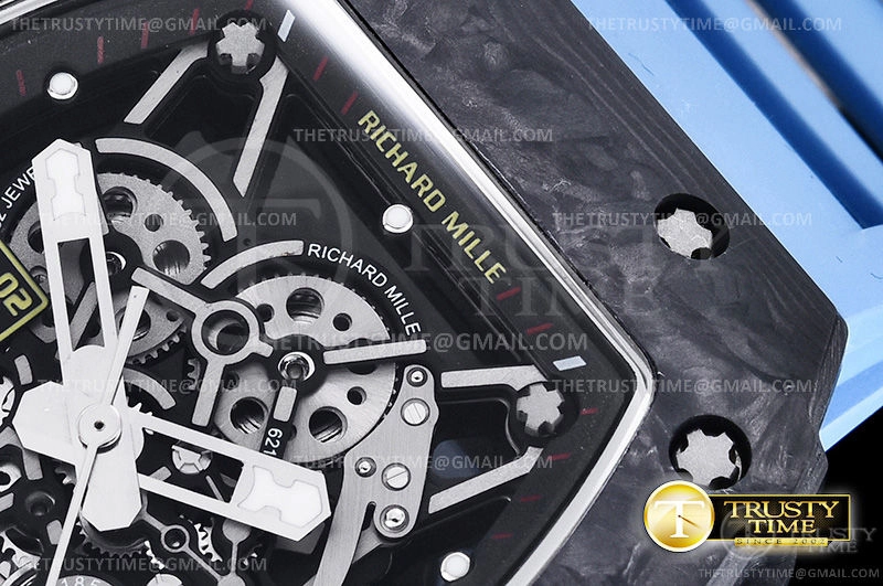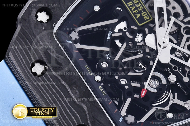 Часы Richard Mille из коллекции RM035. Спортивные мужские часы Richard Mille RM035-02 Rafael Nadal премиального качества (Артикул магазина: RM-0333) оснащены надежным автоматическим механизмом с автоподзаводом (работает от амплитуды движения руки) калибра MY8215, в котором реализованы следующие функции: часовая, минутная и секундная стрелки, а так же максимально простой функционал без усложнений. Бочкообразный корпус часов черного цвета, имеющий размер 42 мм X 50 мм и высоту 17 мм превосходно дополнит образ и украсит запястье своего обладателя. Для изготовления часов Richard Mille RM035-02 Rafael Nadal предлагаемых в нашем интернет-магазине, применяются кованый карбон высокого качества (Швейцарский стандарт), а так же сапфировое стекло высокой прочности, благодаря чему обеспечивается максимальная защита от сколов и механических повреждений. Отличительной чертой данной модели является скелетонизированный циферблат, часовые индексы которого обеспечивают часовые метки. Завершает образ каучуковый ремешок голубого цвета с фирменной раскладывающейся застежкой Richard Mille. Водонепроницаемость данной модели составляет 30М (WR30) – допускается минимальное воздействие с водой.