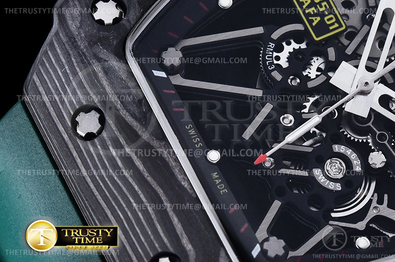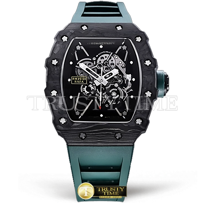 Часы Richard Mille из коллекции RM035. Спортивные мужские часы Richard Mille RM035-01 Rafael Nadal премиального качества (Артикул магазина: RM-0319) оснащены надежным автоматическим механизмом с автоподзаводом (работает от амплитуды движения руки) калибра MY8215, в котором реализованы следующие функции: часовая, минутная и секундная стрелки, а так же максимально простой функционал без усложнений. Бочкообразный корпус часов черного цвета, имеющий размер 42 мм X 50 мм и высоту 17 мм превосходно дополнит образ и украсит запястье своего обладателя. Для изготовления часов Richard Mille RM035-01 Rafael Nadal предлагаемых в нашем интернет-магазине, применяются кованый карбон высокого качества (Швейцарский стандарт), а так же сапфировое стекло высокой прочности, благодаря чему обеспечивается максимальная защита от сколов и механических повреждений. Отличительной чертой данной модели является скелетонизированный циферблат, часовые индексы которого обеспечивают часовые метки. Завершает образ каучуковый ремешок зеленого цвета с фирменной раскладывающейся застежкой Richard Mille. Водонепроницаемость данной модели составляет 30М (WR30) – допускается минимальное воздействие с водой.