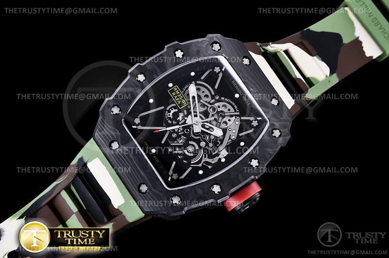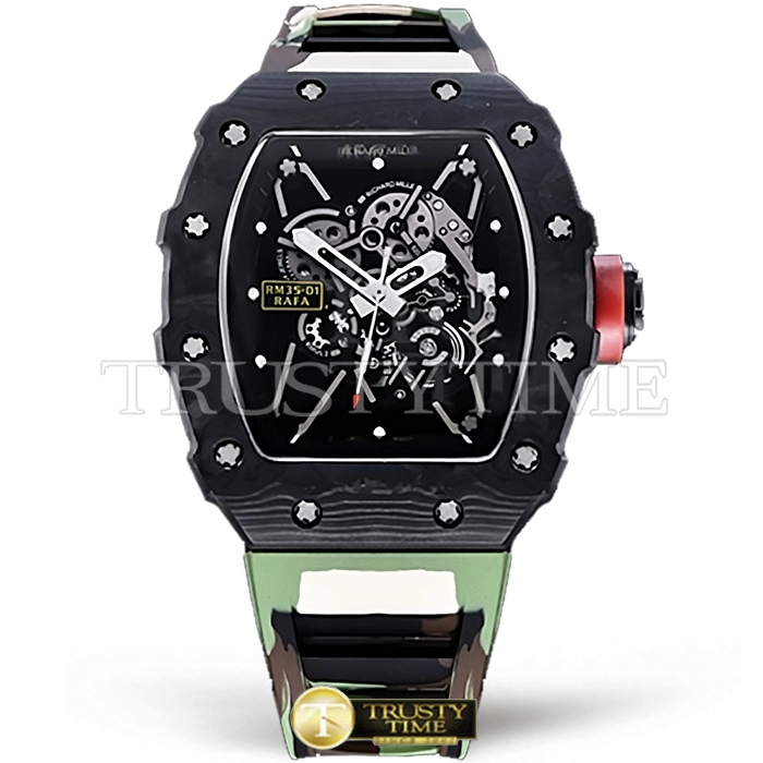Часы Richard Mille из коллекции RM035. Спортивные мужские часы Richard Mille RM035-01 Rafael Nadal премиального качества (Артикул магазина: RM-0324) оснащены надежным автоматическим механизмом с автоподзаводом (работает от амплитуды движения руки) калибра MY8215, в котором реализованы следующие функции: часовая, минутная и секундная стрелки, а так же максимально простой функционал без усложнений. Бочкообразный корпус часов черного цвета, имеющий размер 42 мм X 50 мм и высоту 17 мм превосходно дополнит образ и украсит запястье своего обладателя. Для изготовления часов Richard Mille RM035-01 Rafael Nadal предлагаемых в нашем интернет-магазине, применяются кованый карбон высокого качества (Швейцарский стандарт), а так же сапфировое стекло высокой прочности, благодаря чему обеспечивается максимальная защита от сколов и механических повреждений. Отличительной чертой данной модели является скелетонизированный циферблат, часовые индексы которого обеспечивают часовые метки. Завершает образ каучуковый ремешок камуфляжного цвета с фирменной раскладывающейся застежкой Richard Mille. Водонепроницаемость данной модели составляет 30М (WR30) – допускается минимальное воздействие с водой.