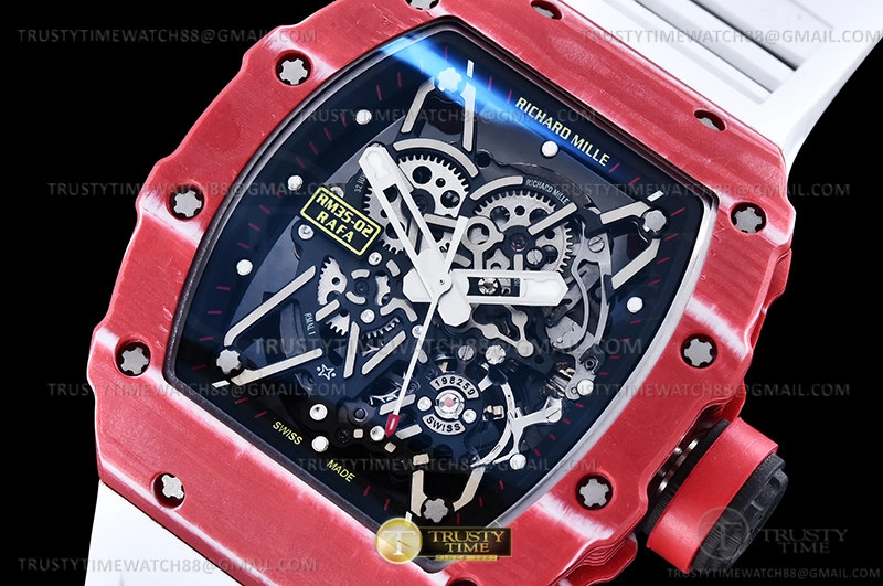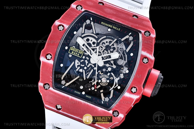 Часы Richard Mille из коллекции RM035. Спортивные мужские часы Richard Mille RM035-02 Rafael Nadal премиального качества (Артикул магазина: RM-0572) оснащены надежным автоматическим механизмом с ручным заводом калибра RMUL2, в котором реализованы следующие функции: часовая, минутная и секундная стрелки, а так же максимально простой функционал без усложнений. Бочкообразный корпус часов красного цвета, имеющий размер 50 мм x 44.5 мм и высоту 14 мм превосходно дополнит образ и украсит запястье своего обладателя. Для изготовления часов Richard Mille RM035-02 Rafael Nadal предлагаемых в нашем интернет-магазине, применяются карбон NTPT высокого качества (Швейцарский стандарт), а так же сапфировое стекло высокой прочности, благодаря чему обеспечивается максимальная защита от сколов и механических повреждений. Отличительной чертой данной модели является скелетонизированный циферблат, часовые индексы которого обеспечивают часовые метки. Завершает образ каучуковый ремешок белого цвета с фирменной раскладывающейся застежкой Richard Mille. Водонепроницаемость данной модели составляет 30М (WR30) – допускается минимальное воздействие с водой.