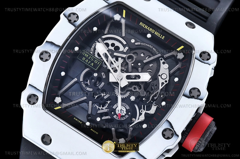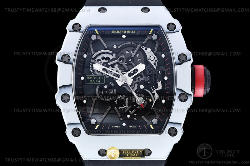 Часы Richard Mille из коллекции RM035. Спортивные мужские часы Richard Mille RM035-01 Rafael Nadal премиального качества (Артикул магазина: RM-0576) оснащены надежным автоматическим механизмом с ручным заводом калибра RMUL3, в котором реализованы следующие функции: часовая, минутная и секундная стрелки, а так же максимально простой функционал без усложнений. Бочкообразный корпус часов белого цвета, имеющий размер 50 мм x 43 мм и высоту 14 мм превосходно дополнит образ и украсит запястье своего обладателя. Для изготовления часов Richard Mille RM035-01 Rafael Nadal предлагаемых в нашем интернет-магазине, применяются карбон NTPT высокого качества (Швейцарский стандарт), а так же сапфировое стекло высокой прочности, благодаря чему обеспечивается максимальная защита от сколов и механических повреждений. Отличительной чертой данной модели является скелетонизированный циферблат, часовые индексы которого обеспечивают часовые метки. Завершает образ каучуковый ремешок черного цвета с фирменной раскладывающейся застежкой Richard Mille. Водонепроницаемость данной модели составляет 30М (WR30) – допускается минимальное воздействие с водой.