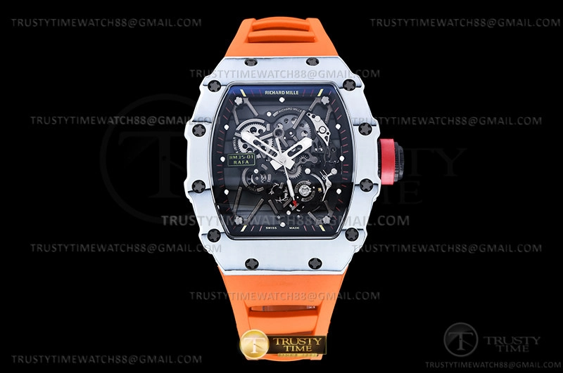 Часы Richard Mille из коллекции RM035. Спортивные мужские часы Richard Mille RM035-01 Rafael Nadal премиального качества (Артикул магазина: RM-0577) оснащены надежным автоматическим механизмом с ручным заводом калибра RMUL3, в котором реализованы следующие функции: часовая, минутная и секундная стрелки, а так же максимально простой функционал без усложнений. Бочкообразный корпус часов белого цвета, имеющий размер 50 мм x 43 мм и высоту 14 мм превосходно дополнит образ и украсит запястье своего обладателя. Для изготовления часов Richard Mille RM035-01 Rafael Nadal предлагаемых в нашем интернет-магазине, применяются карбон NTPT высокого качества (Швейцарский стандарт), а так же сапфировое стекло высокой прочности, благодаря чему обеспечивается максимальная защита от сколов и механических повреждений. Отличительной чертой данной модели является скелетонизированный циферблат, часовые индексы которого обеспечивают часовые метки. Завершает образ каучуковый ремешок оранжевого цвета с фирменной раскладывающейся застежкой Richard Mille. Водонепроницаемость данной модели составляет 30М (WR30) – допускается минимальное воздействие с водой.