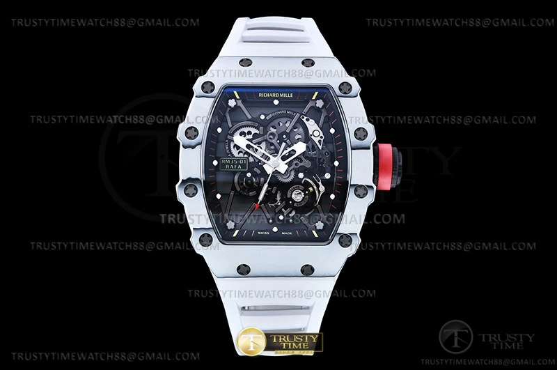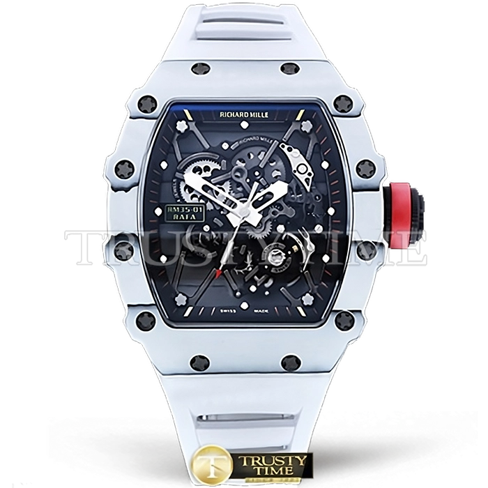 Часы Richard Mille из коллекции RM035. Спортивные мужские часы Richard Mille RM035-01 Rafael Nadal премиального качества (Артикул магазина: RM-0580) оснащены надежным автоматическим механизмом с ручным заводом калибра RMUL3, в котором реализованы следующие функции: часовая, минутная и секундная стрелки, а так же максимально простой функционал без усложнений. Бочкообразный корпус часов белого цвета, имеющий размер 50 мм x 43 мм и высоту 14 мм превосходно дополнит образ и украсит запястье своего обладателя. Для изготовления часов Richard Mille RM035-01 Rafael Nadal предлагаемых в нашем интернет-магазине, применяются карбон NTPT высокого качества (Швейцарский стандарт), а так же сапфировое стекло высокой прочности, благодаря чему обеспечивается максимальная защита от сколов и механических повреждений. Отличительной чертой данной модели является скелетонизированный циферблат, часовые индексы которого обеспечивают часовые метки. Завершает образ каучуковый ремешок белого цвета с фирменной раскладывающейся застежкой Richard Mille. Водонепроницаемость данной модели составляет 30М (WR30) – допускается минимальное воздействие с водой.
